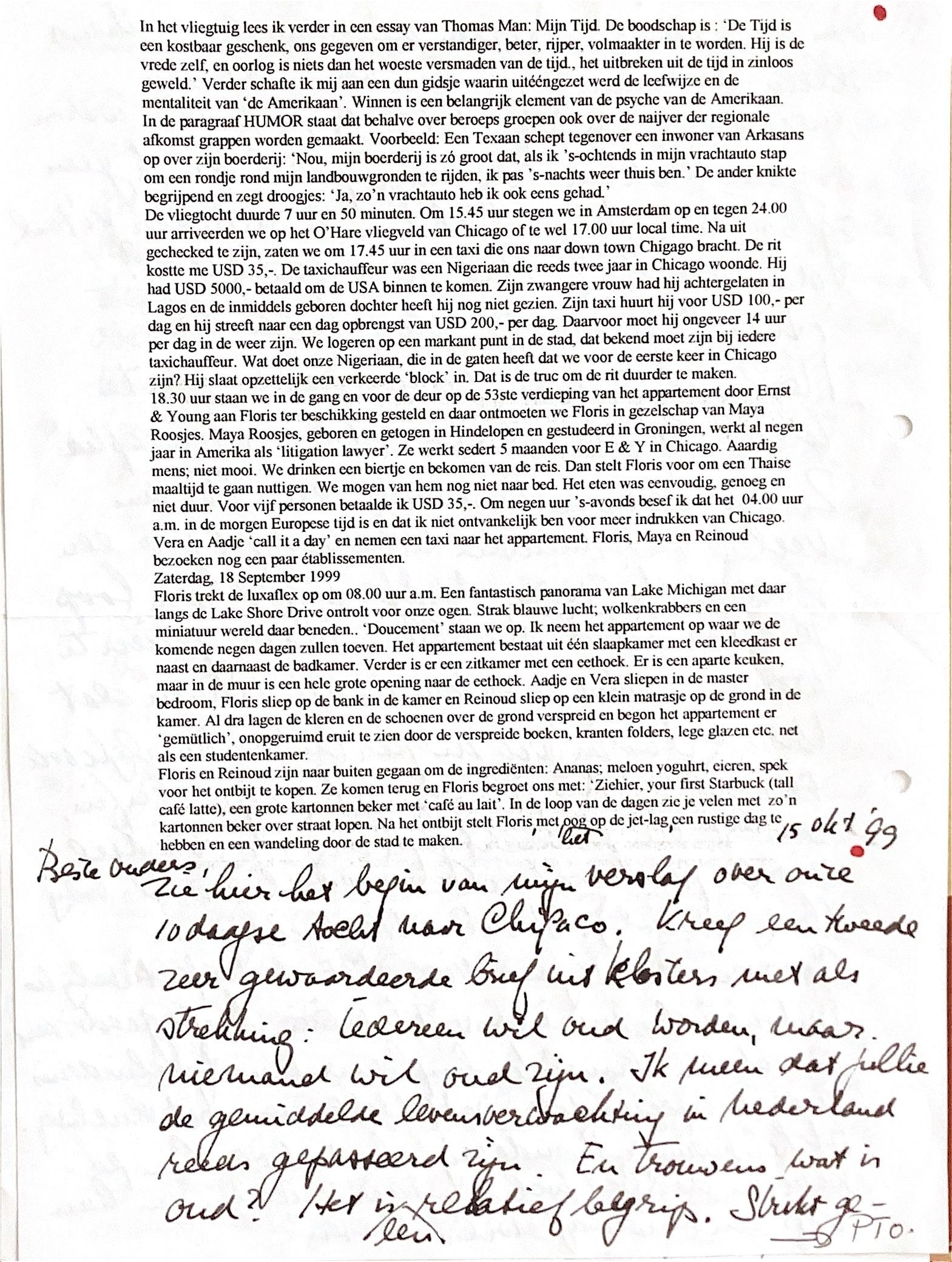 De vliegtocht Amsterdam-Chicago duurde 7 uur en 50 minuten. om 15.45 uur stegen we in Amsterdam op en tegen 24.00 uur arriveerden we op het O'Hare vliegveld van Chicago of te wel 17.00 uur 'local time'. Na uitgecheckt te zijn, zaten we om 17.45 uur in een taxi die ons naar 'down town ' Chicago bracht. De rit kostte me USD 35,- De taxichauffeur was een Nigeriaan, die reeds twee jaar in Chicago woonde.Hij had USD 5000,-betaald om de USA binnen te komen. Zijn zwangere vrouw had hij achter gelaten in Lagos en de inmiddels geboren dochter heeft hij nog niet gezien. Zijn taxi huurt hij voor USD 100,- per dag en streeft naar een dagopbrengst van USD 200,- per dag. Daarvoor moet hij ongeveer 14 uur per dag in de weer zijn. We logeren op een markant punt in de stad, dat bekend moet zijn bij iedere taxichauffeur. Wat doet onze Nigeriaan, die in de gaten heeft dat wij voor de eerste keer in Chicago zijn? Hij slaat opzettelijk een verkeerd 'block' in. Dat is de truc om de rit duurde te maken. Enfin, om18.30 uur staan we voor de deur van het appartement van Floris op de 53ste verdieping van een "skyscraper," dat door Ernst & Young aan hem ter beschikking is gesteld en daar ontmoeten we Floris in gezelschap van Maya Roosjes, geboren en getogen in Hindelopen en gestudeerd in Groningen, die al 9 jaar werkt in Amerika als "litigation lawyer". Zij werkt sedert 5 maanden voor E&Y in Chicago. Aardige persoon maar niet aantrekkelijk 'à mon avis.' We drinken een biertje en bekomen van de reis. Dan stelt Floris voor om een Thaise te nuttigen. We mogen van hem nog niet naar bed. Het eten was eenvoudig, genoeg en niet al te duur. Voor vijf personen mocht ik USD 35,- betalen. Om negen uur 's-avonds in Chicago besefte ik dat het 04.00 uur am in Europa was en ik niet ontvankelijk ben voor meer indrukken van Chicago. Vera & Aadje "call it a day"en nemen een taxi naar Floris' appartement. Floris , Maya en Reinoud bezoeken nog een paar etablissementen.