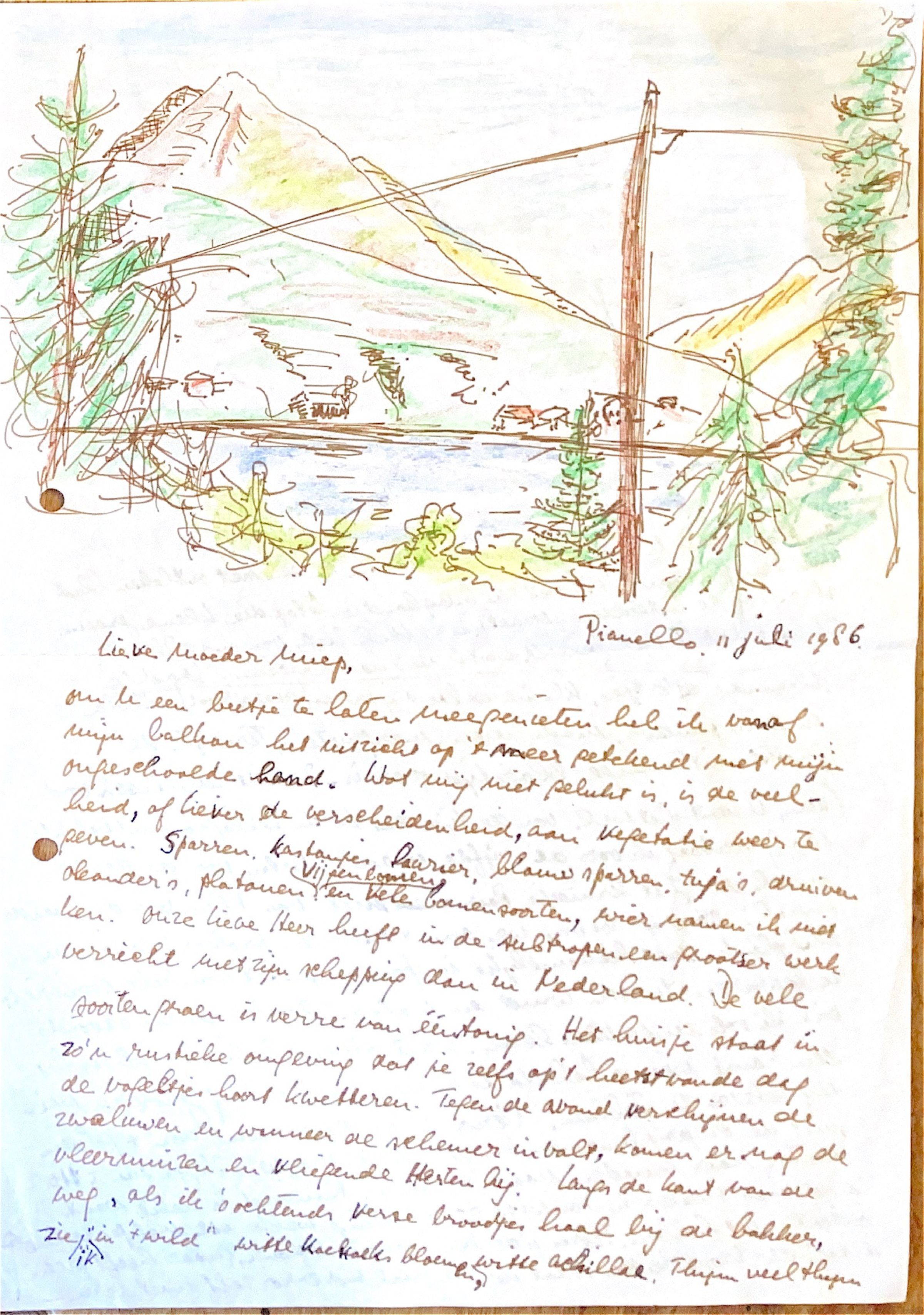 Om U een beetje te laten meegenieten heb ik vanaf ons balkon het uitzicht op het Como meer getekend met mijn ongeschoolde hand. Wat mij niet gelukt is, is de veelheid, of liever gezegd, de verscheidenheid aan vegetatie weer te geven. Sparren, kastanjes, laurier, blauwe sparren tuja's, druiven, oleanders, platanen, vijgenbomen en de vele boomsoorten, wier namen ik niet ken. Onze lieve Heer heeft in de subtropen een groter werk verricht met zijn schepping, dan in Nederland. De vele tinten groen is verre van ééntonig.