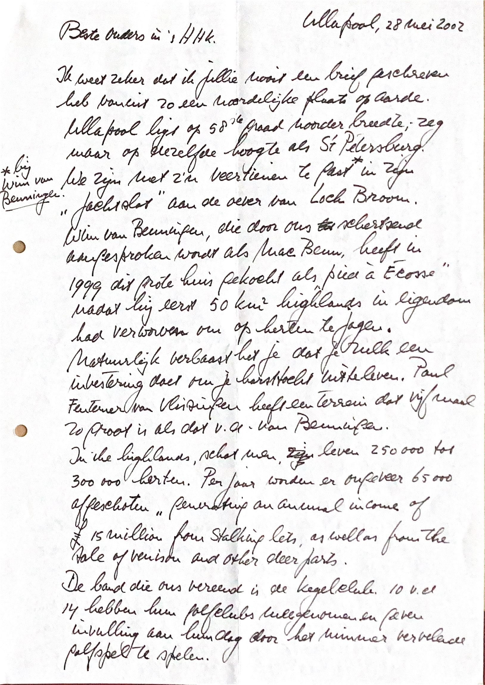 We zijn hier met veertien "Bierkegelaars" te gast bij Wim van Beuningen in zijn "jachtslot" aan de over van Loch Broom. Wim van Beuningen, die door ons schertsend wordt aangesproken met "Mac Beun", heeft in 1999 dit grote huis gekocht als "pied à terre à Écosse"nadat hij 50 km2 Highland in eigendo m verworven had om op herten te jagen.