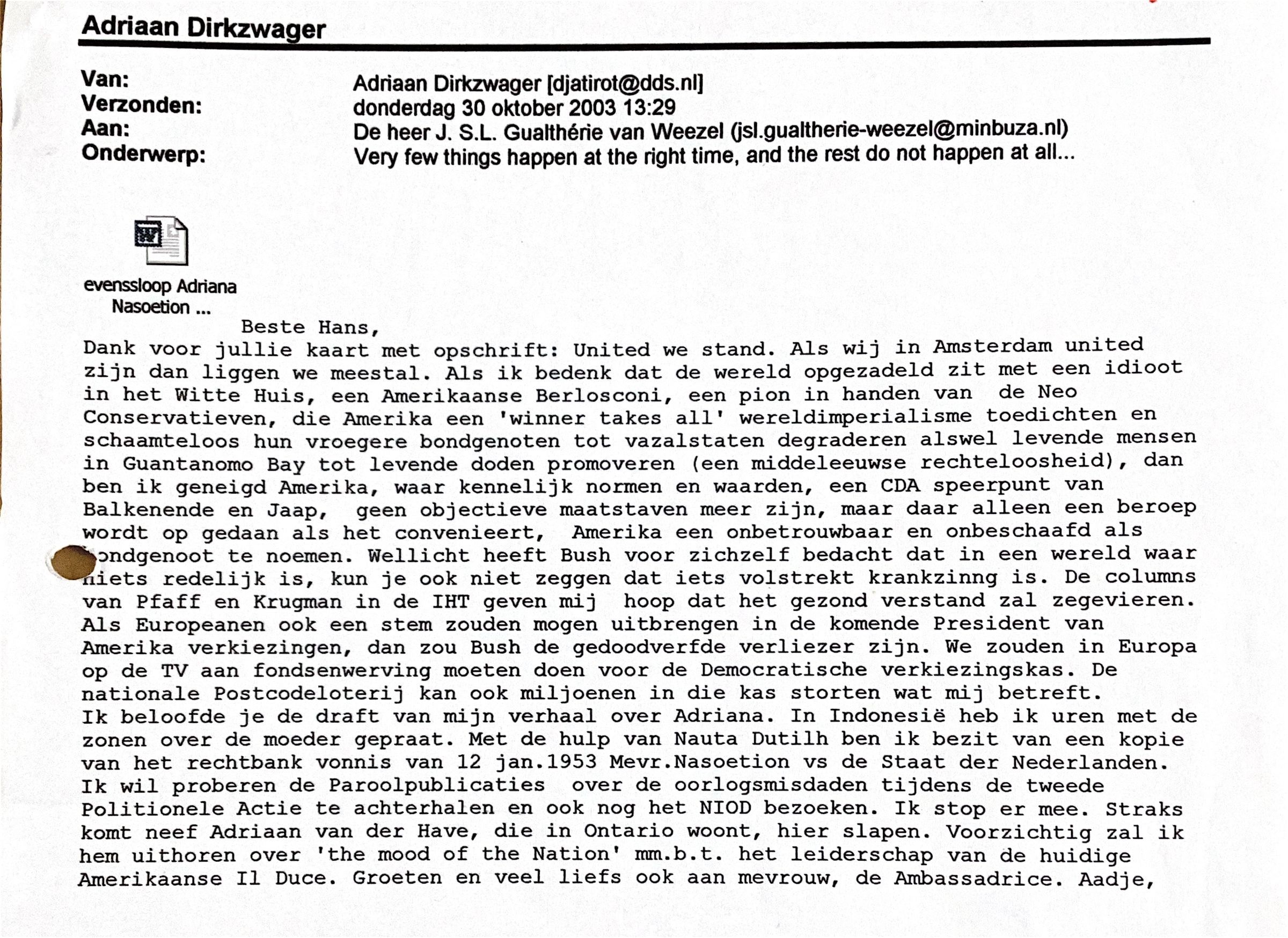 Ik beloofde je het concept van mijn verhaal over Adriana te sturen. In Indonesië heb ik uren met de zonen over hun moeder gepraat. Met behulp van Nauta Dutihl ben ik in bezit gekomen van een kopie van het rechtbankvonnis van 12 januari 1953: Mevr. Nasoetion versus de Staat der Nederlanden.