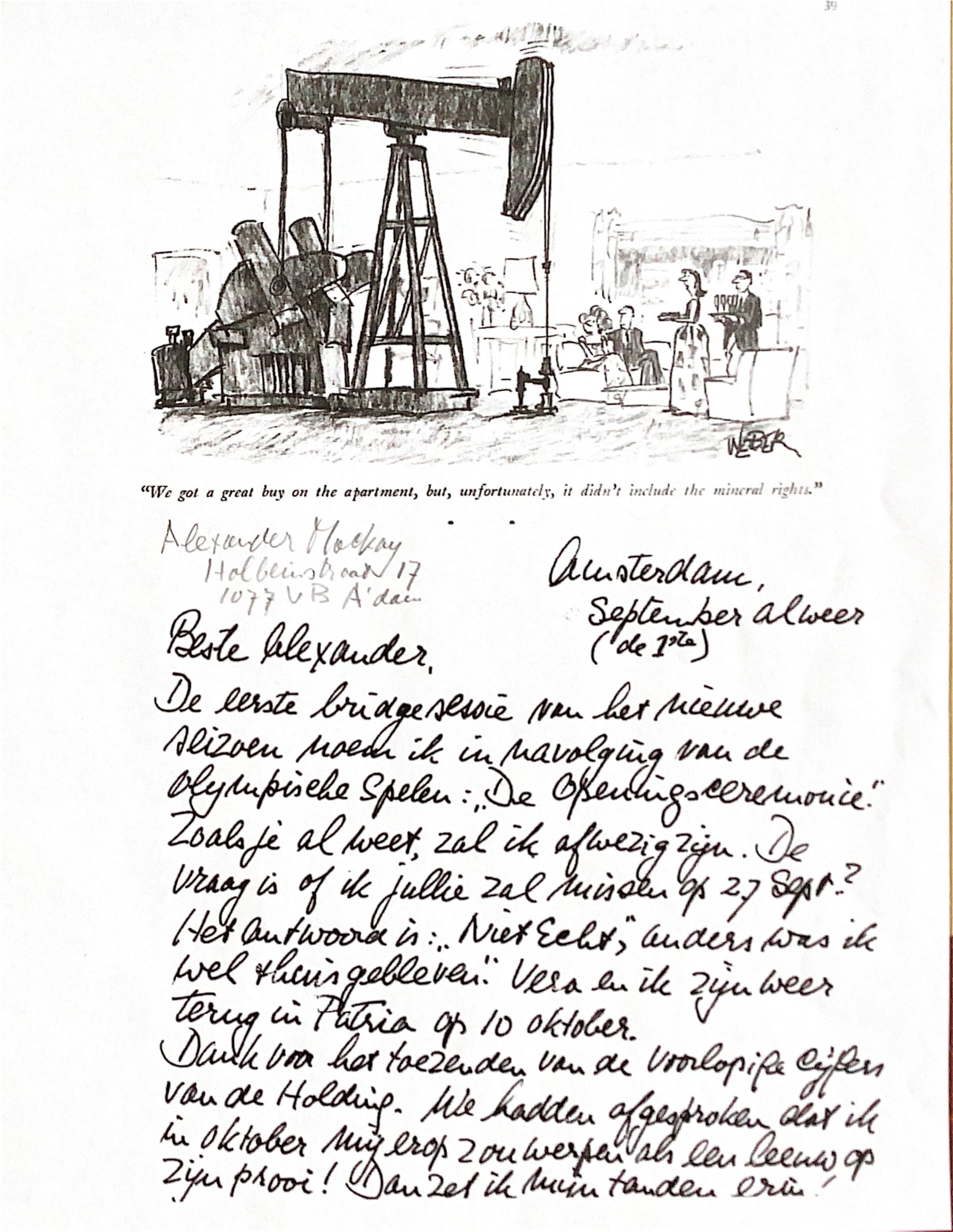 De eerste bridgesessie van het nieuwe seizoen noem ik in navolging van de Olympische spelen: "De Openingsceremonie." Zoals je al weet, zal ik afwezig zijn. De vraag is of ik jullie zal missen op 27 september? Het antwoord is: "Niet echt, anders was ik wel thuisgebleven." Vera en ik zijn weer terug in Patria op 10 oktober.