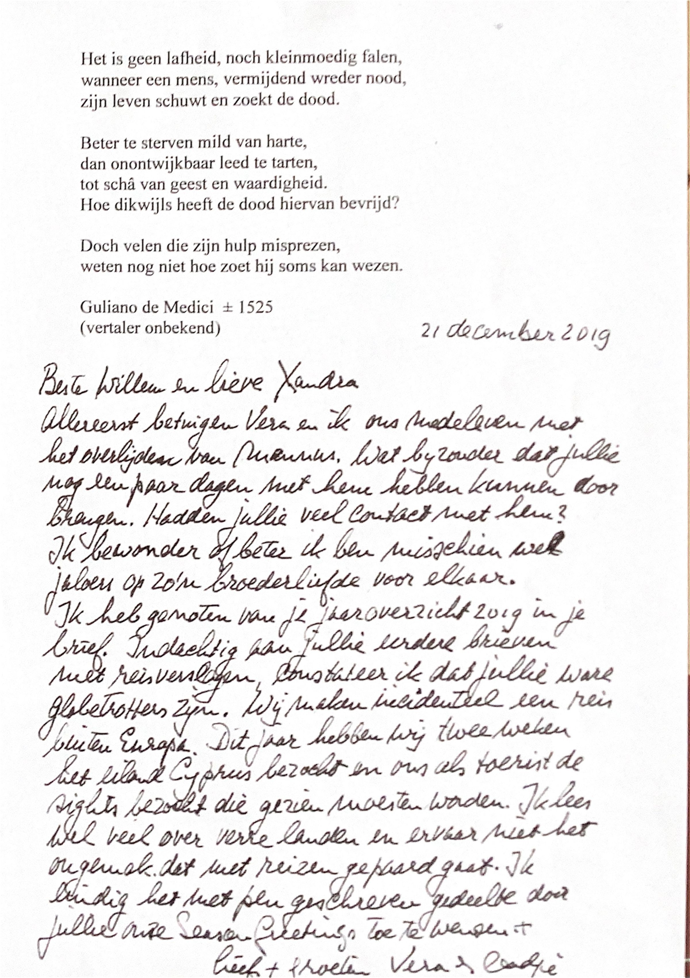 allereerst betuigen Vera en ik ons medeleven met het overlijden van Mannes. Wat bijzonder dat jullie nog een paar dagen met hem hebben kunnen doorbrengen. Hadden jullie veel contact met hem?