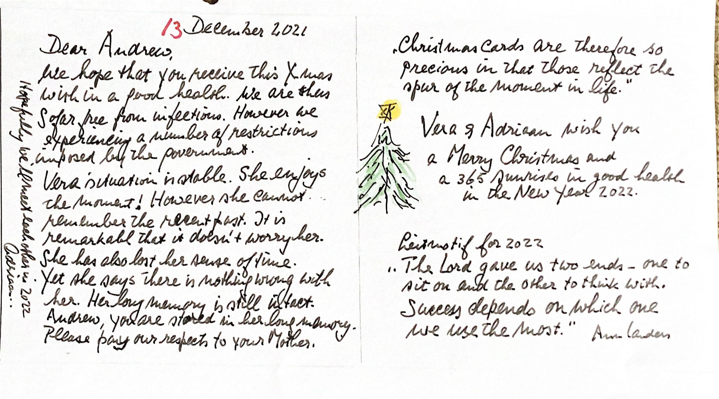 we hope that you receive thie X-mas wish in a good health. We are thus sofar free from Covid infection. However we exeperience a number of restrictions imposed by the government.