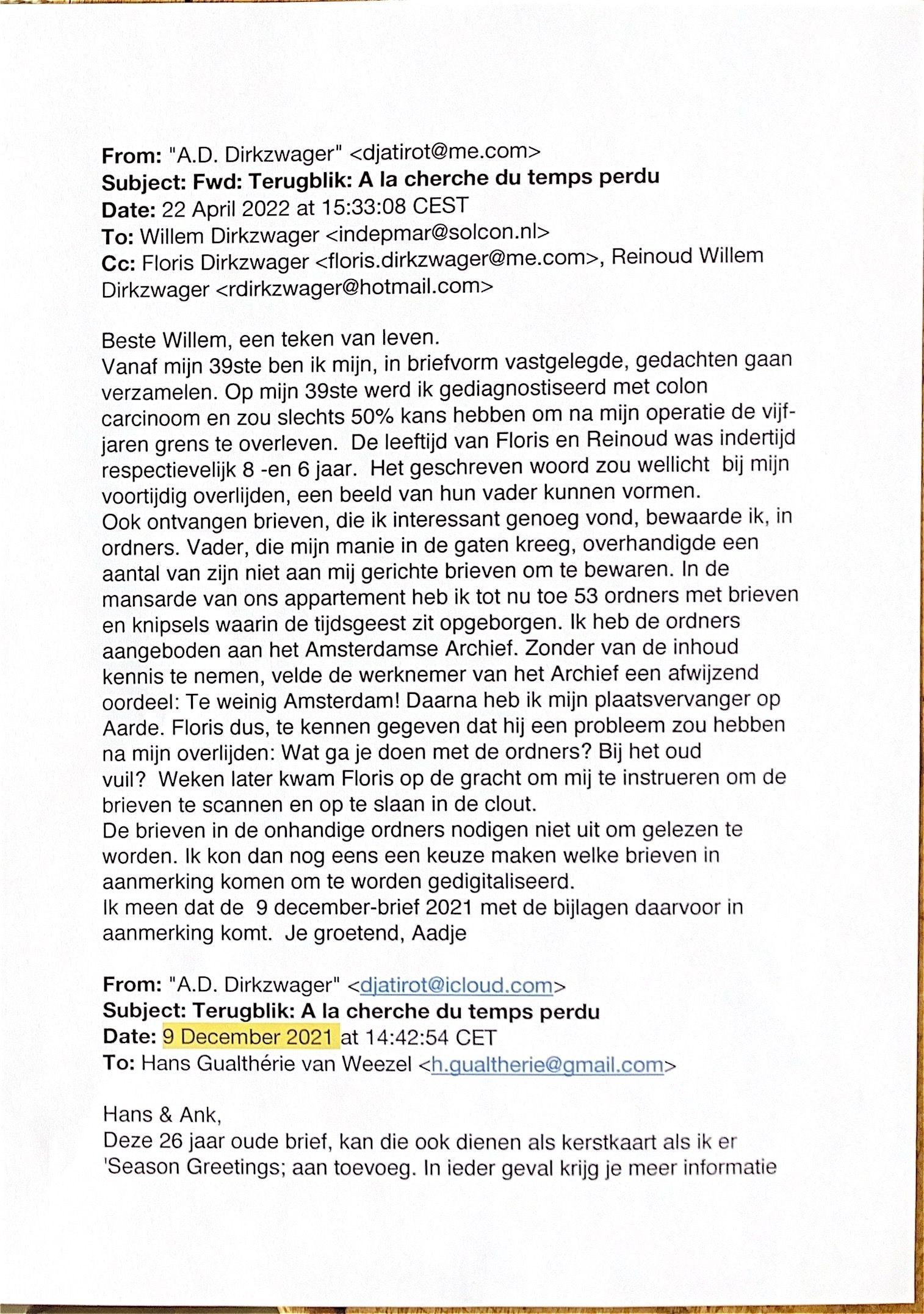 Daarna heb ik mijn plaatsvervanger op Aarde, Floris dus, te kennen gegeven, dat hij een probleem zou hebben na mijn overlijden. Wat ga je met de ordners doen? Bij het oud vuil op de straat zetten? Een paar weken later kwam Floris op de Keizersgracht om mij te instrueren om de brieven te scannen en op te slaan in de 'Clout.' De brieven in die onhandige ordners nodigen niet uit om gelezen te worden. Bovendien kon ik dan nog eens een keuze maken welke brieven in aanmerking komen om gedigitaliseerd te worden.