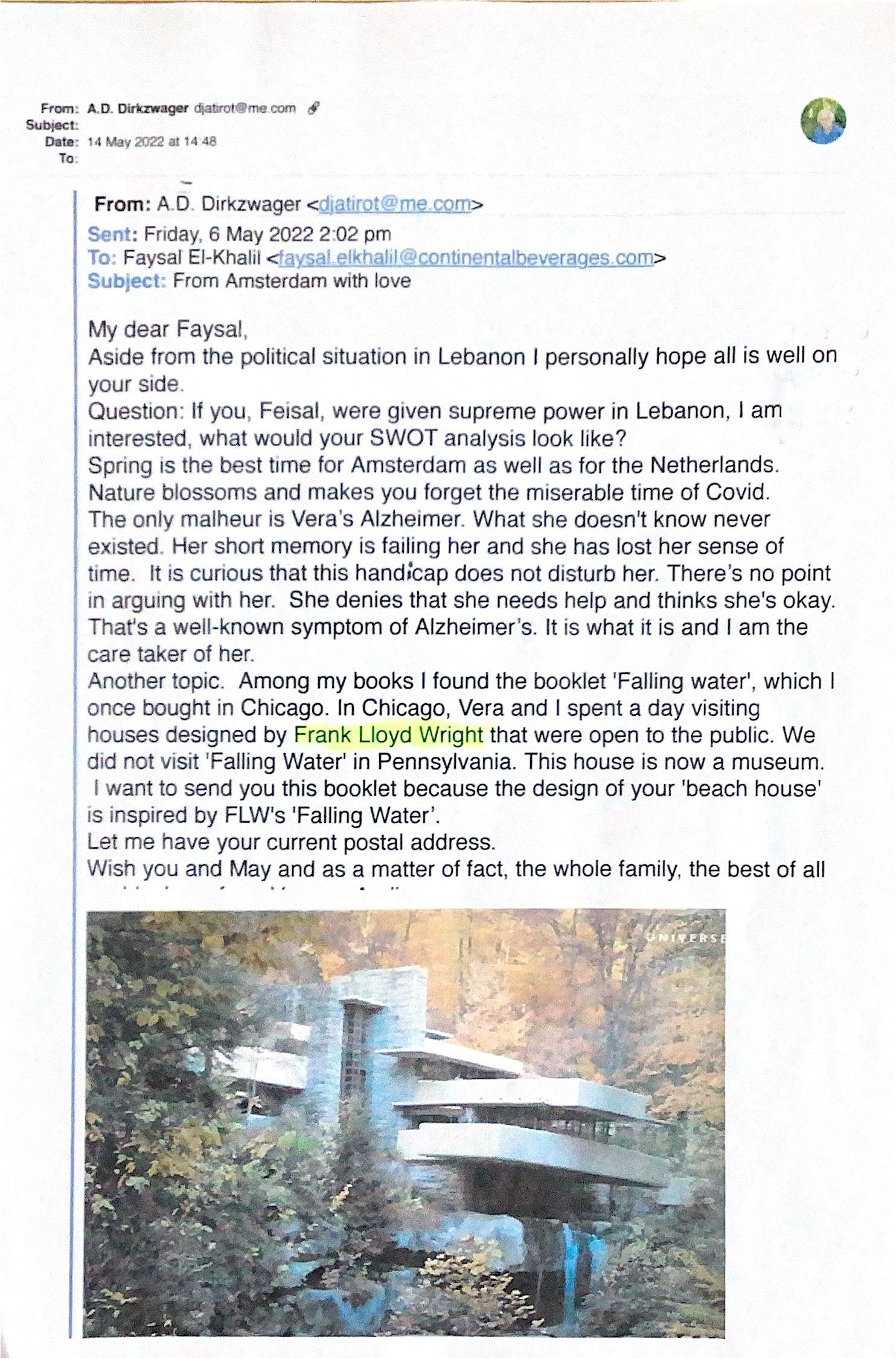 I wanted to send you this booklet because your beach house design was inspired by FLW's "Falling Waters".
