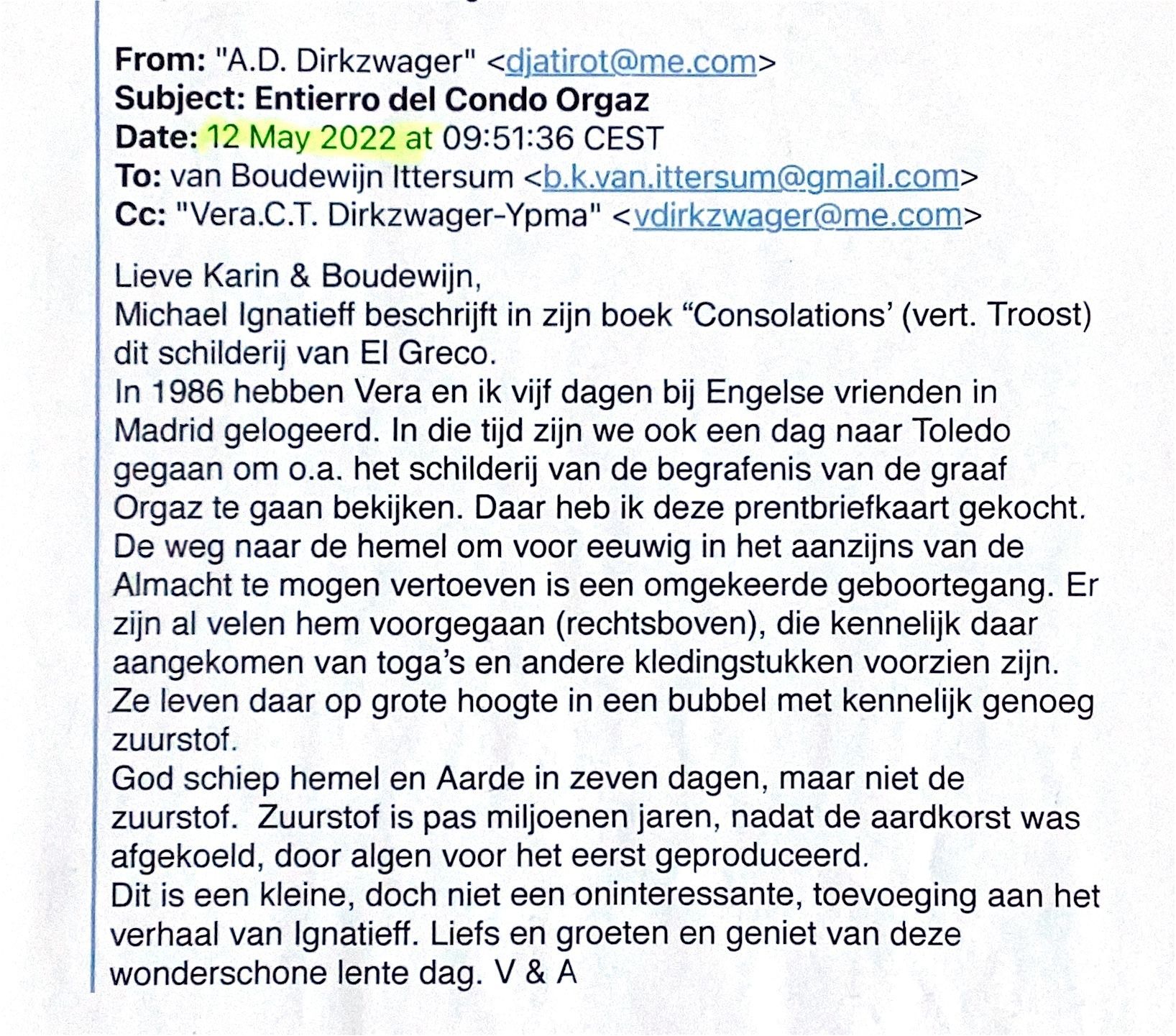 In 1988 hebben Vera en ik vijf dagen bij Engelse vrienden in Madrid gelogeerd. In die tijd zijn we ook een dag naar Toledo gegaan om o.a. het schilderij van de begrafenis van de graaf Orgaz te gaan bekijken. Daar heb deze prentbriefkaart gekocht.
