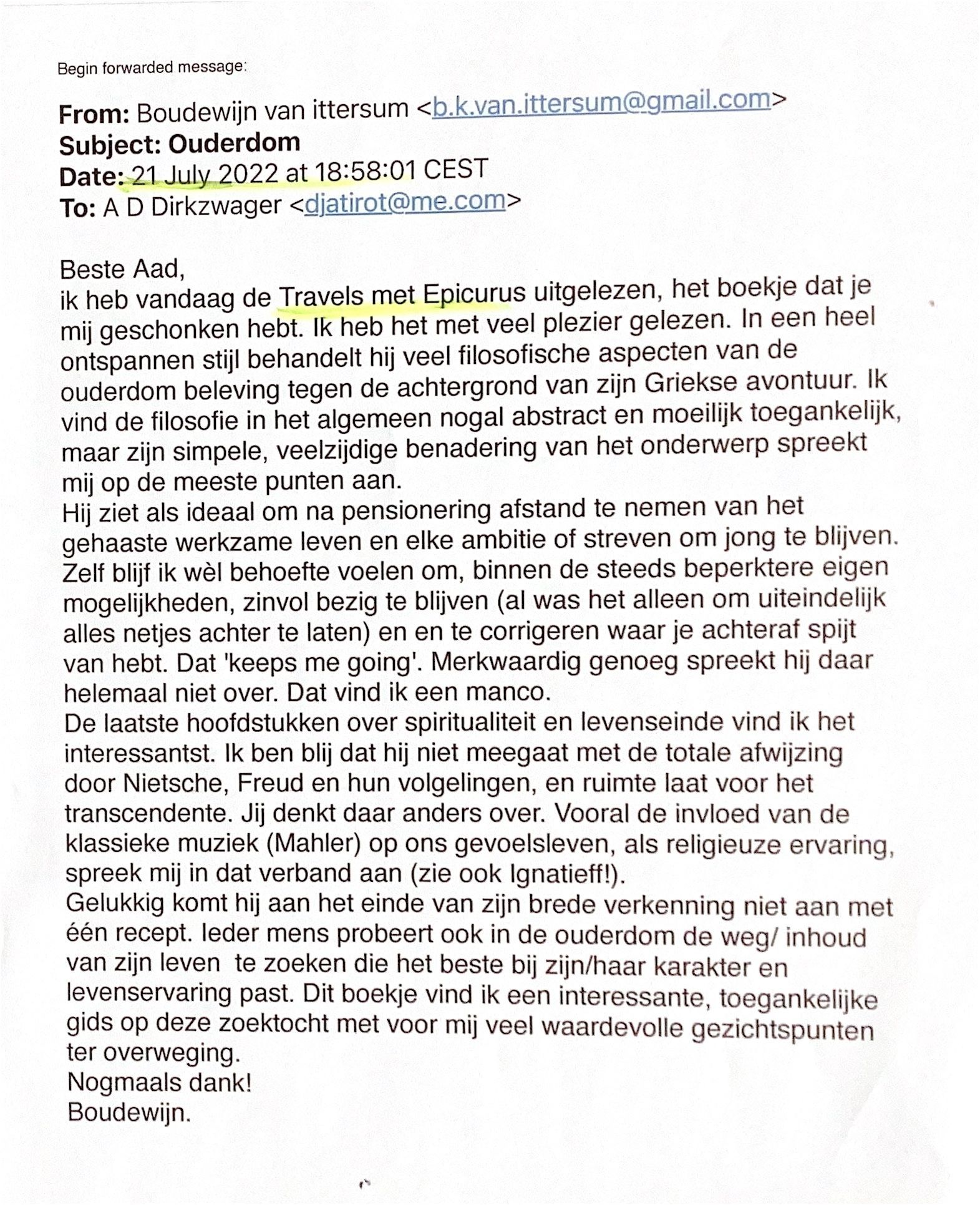 Ik heb vandaag de "Travels met Epicurus" uitgelezen, het boekje dat jij mij geschonken hebt. Ik heb het met veel plezier gelezen. In een heel ontspannen stijl behandelt hij veel filosofische aspecten van de ouderdom beleving tegen tegen de achtergrond van zijn Griekse avontuur. Ik vind de filosofie in het algemeen nogal abstract en moeilijk toegankelijk, maar zijn simpele, veelzijdige benadering van het onderwerp spreekt mij op de meeste punten aan.