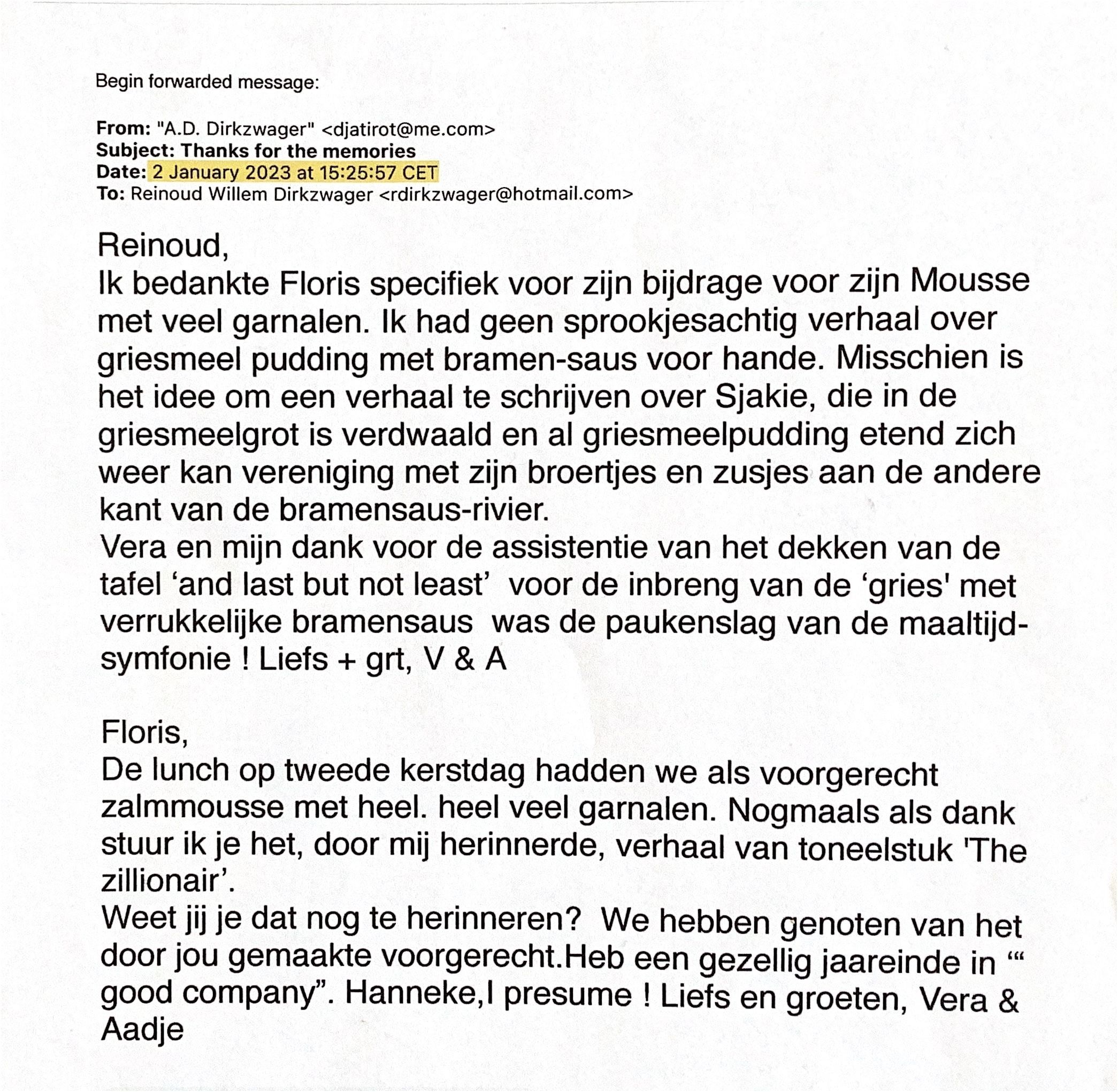 Ik bedankte Floris specifiek voor de bijdrage voor de zalm-mousse met veel garnalen met een verhaal over garnalen. Ik had geen sprookjesachtig verhaal over griesmeelpudding met bramensaus voor handen. Misschien is het een idee om een verhaal te schrijven over Sjakie, die in de griesmeelgrot verdwaald is en al etende zich weer kan vereniging met zijn broertjes en zusjes aan de overkant van de Bramensaus-rivier. Onze dank, die van Vera en van mij, voor de assistentie van het dekken van de tafel voor de laatste kerstbijeenkomst op de gracht en jullie inbreng van de heerlijke gerechten.