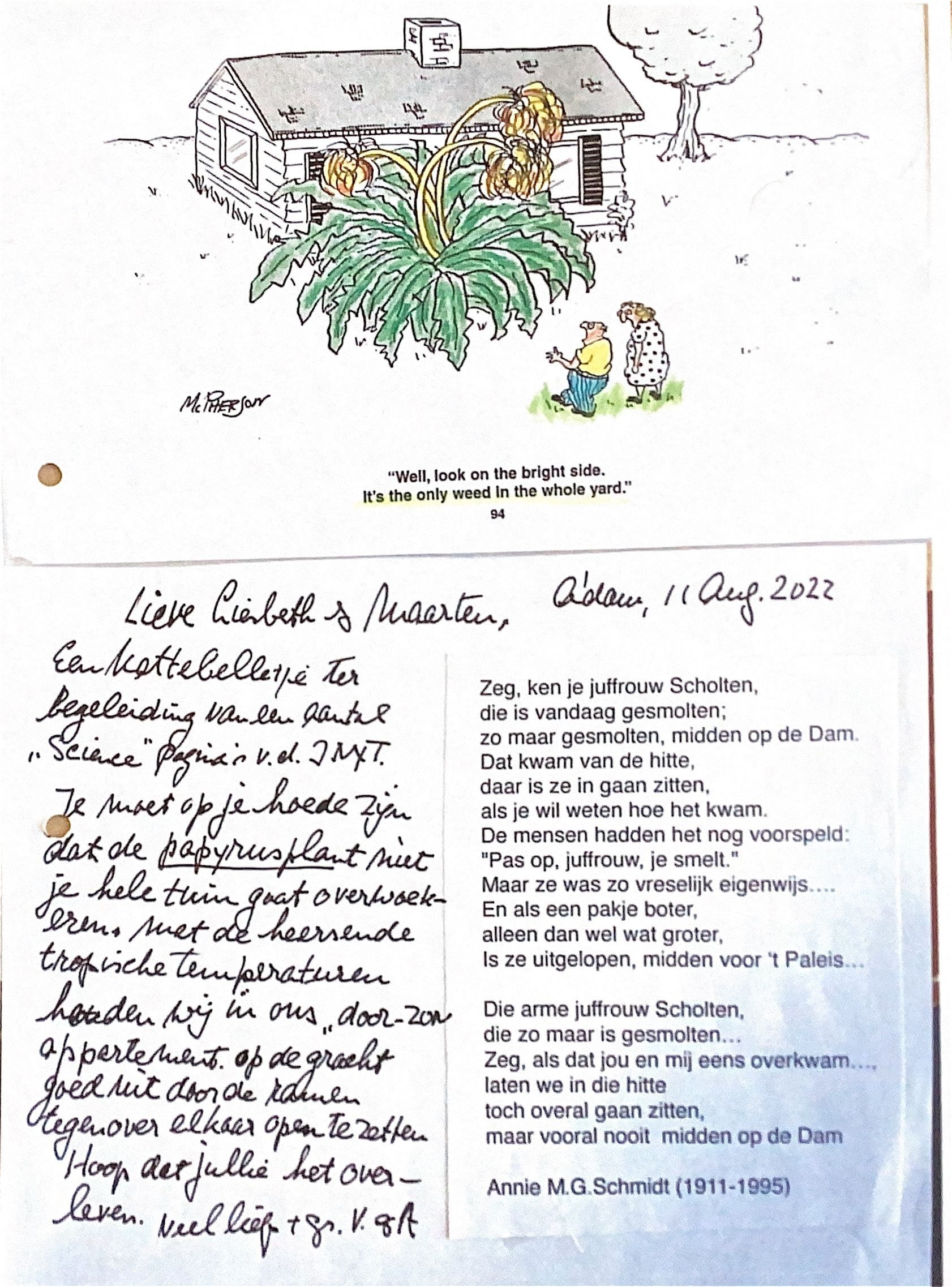 Een kattebelletje ter begeleiding van een aantal "SCIENCe" Pagina's van de Int .New York Times. Jullie moeten op jullie hoeden zijn, dat de Papyrus-plant niet de hele tuin gaat overwoekeren. Met de heersende tropisch temperaturen houden wij in ons "door-zon appartement" op de gracht het goed uit door de ramen tegenover elkaar open te zetten. Hoop dat jullie de hitte overleven.