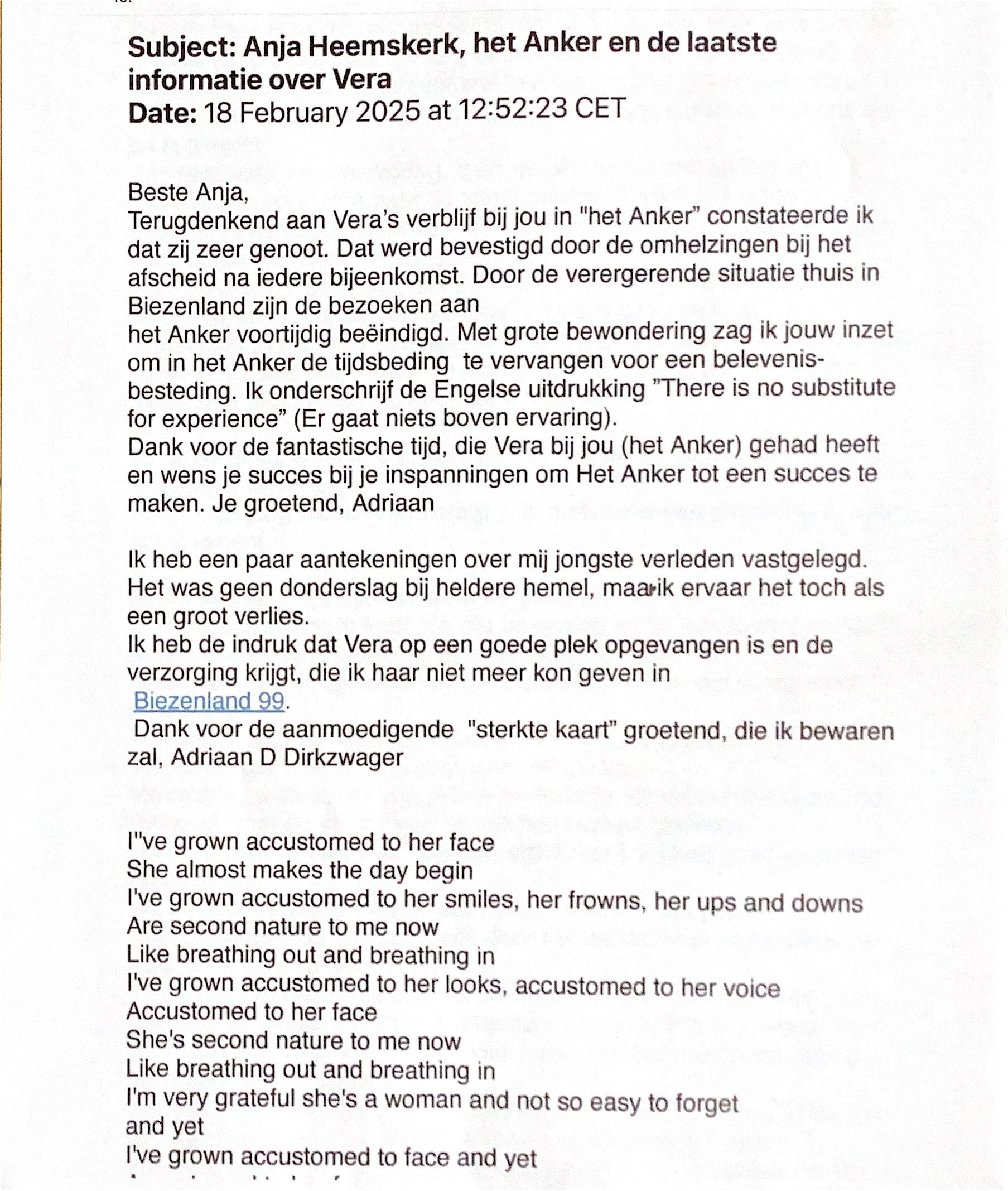 Terugdenkend aan Vera’s verblijf bij jou in "het Anker” constateerde ik dat zij zeer genoot. Dat werd bevestigd door de omhelzingen bij het afscheid na iedere bijeenkomst. Door de verergerende situatie thuis in Biezenland 99 zijn de bezoeken aan het Anker voortijdig beëindigd. Met grote bewondering zag ik jouw inzet om in het Anker de tijdsbeding te vervangen voor een belevenis-besteding. Ik onderschrijf de Engelse uitdrukking ”There is no substitute for experience” (Er gaat niets boven ervaring).