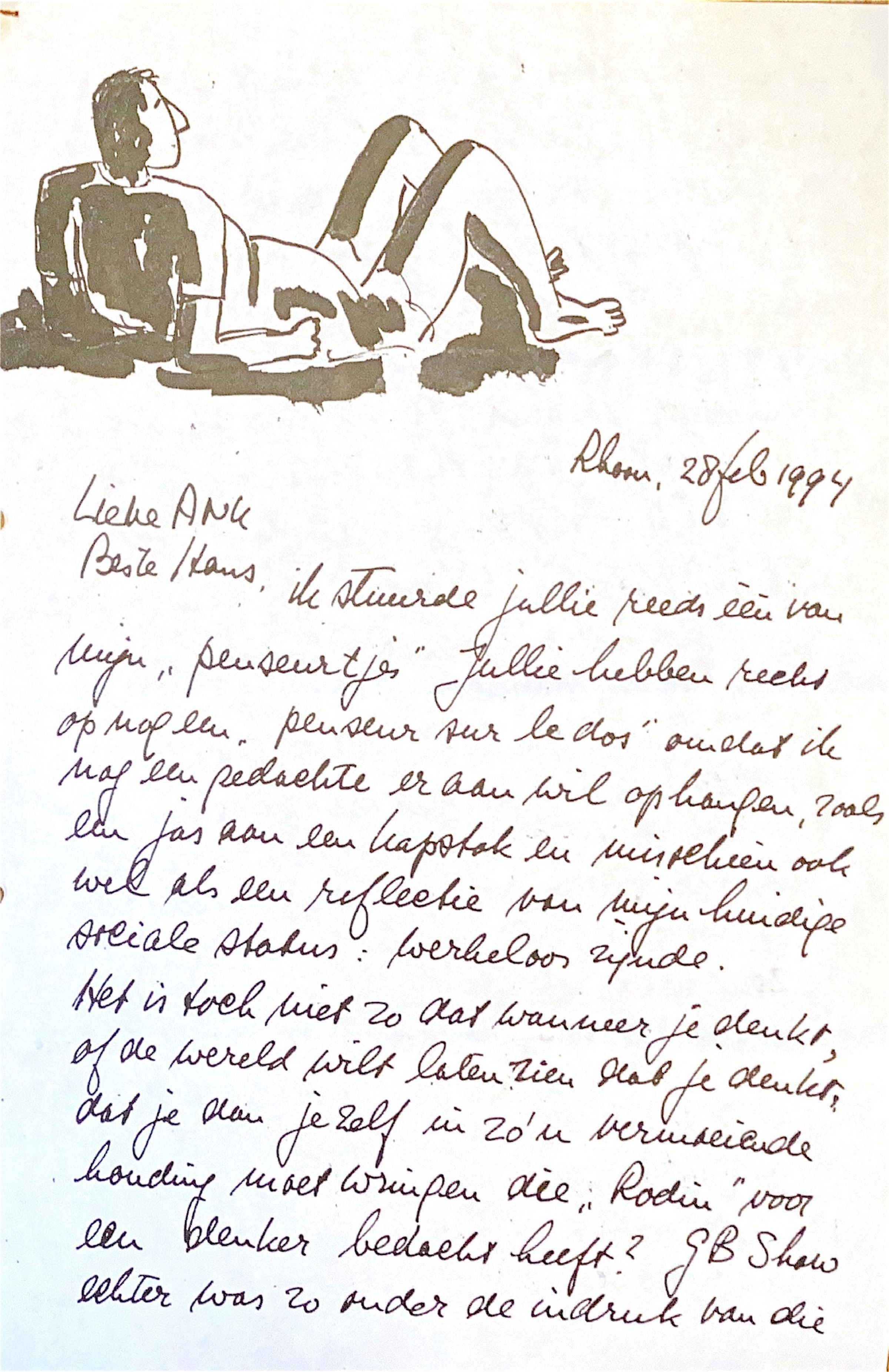 Rodin (1840-1917) voor een"penseur" heeft bedacht? De Ierse schrijver G.B.Shaw (1856-1950) was zo onder de indruk van die houding dat hij van zichzelf door Rodin een beeld heeft laten maken in de houding van Rodin's "penseur," naakt dus. Tot dit punt in de brief heb ik nog mijn kleren weten aan te houden, terwijl ik bij het schrijven ervan toch behoorlijk mijn verstand gebruik. Ik zal geen gewag maken van de staat van ontkleding aan het einde van mijn brief om jullie niet te choqueren.
