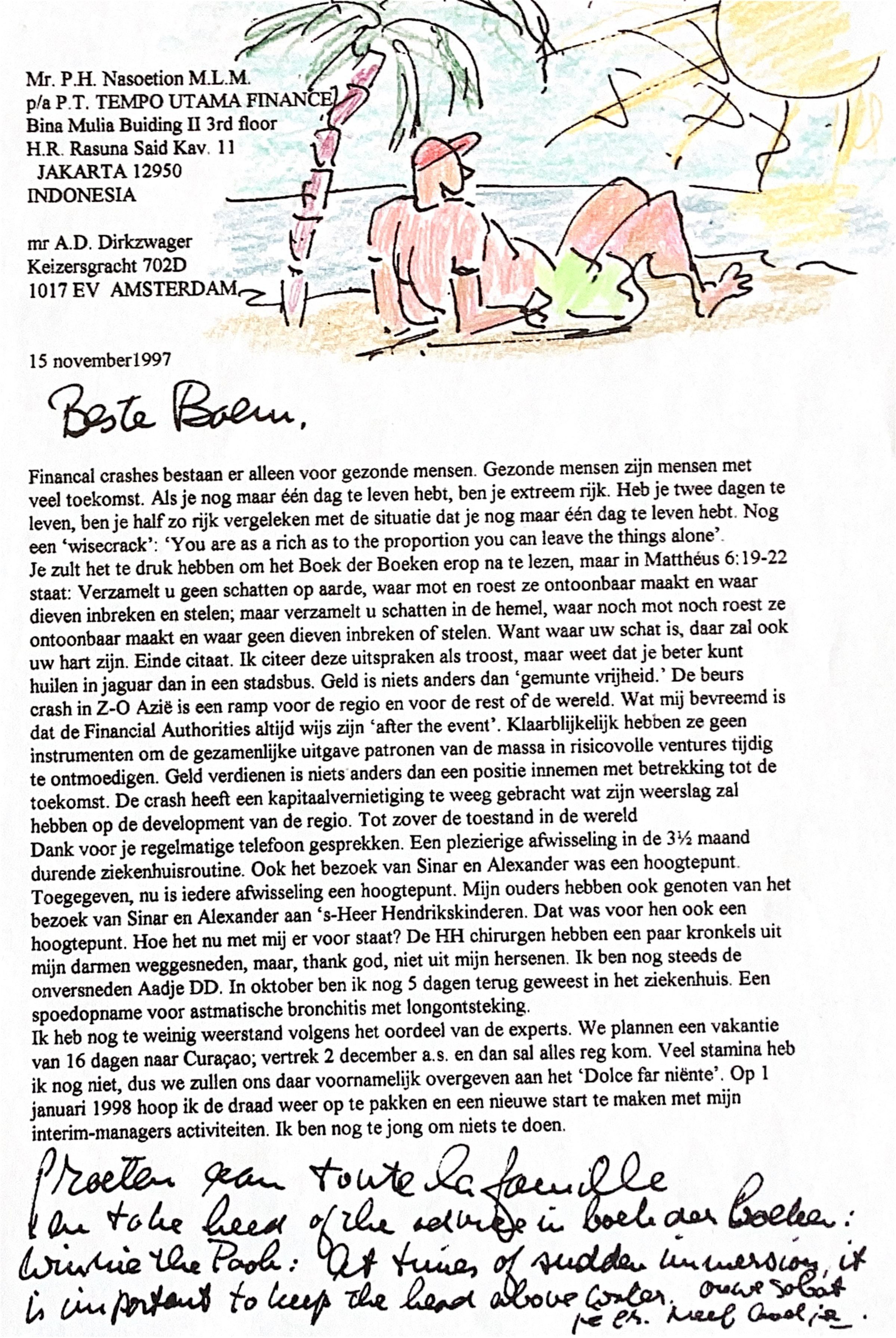 Dank voor je regelmatige telefoon-gesprekken. Een plezierige afwisseling in de 3.5 maand durende ziekenhuis routine. Ook het bezoek van Sinar Alexander was een hoogtepunt..