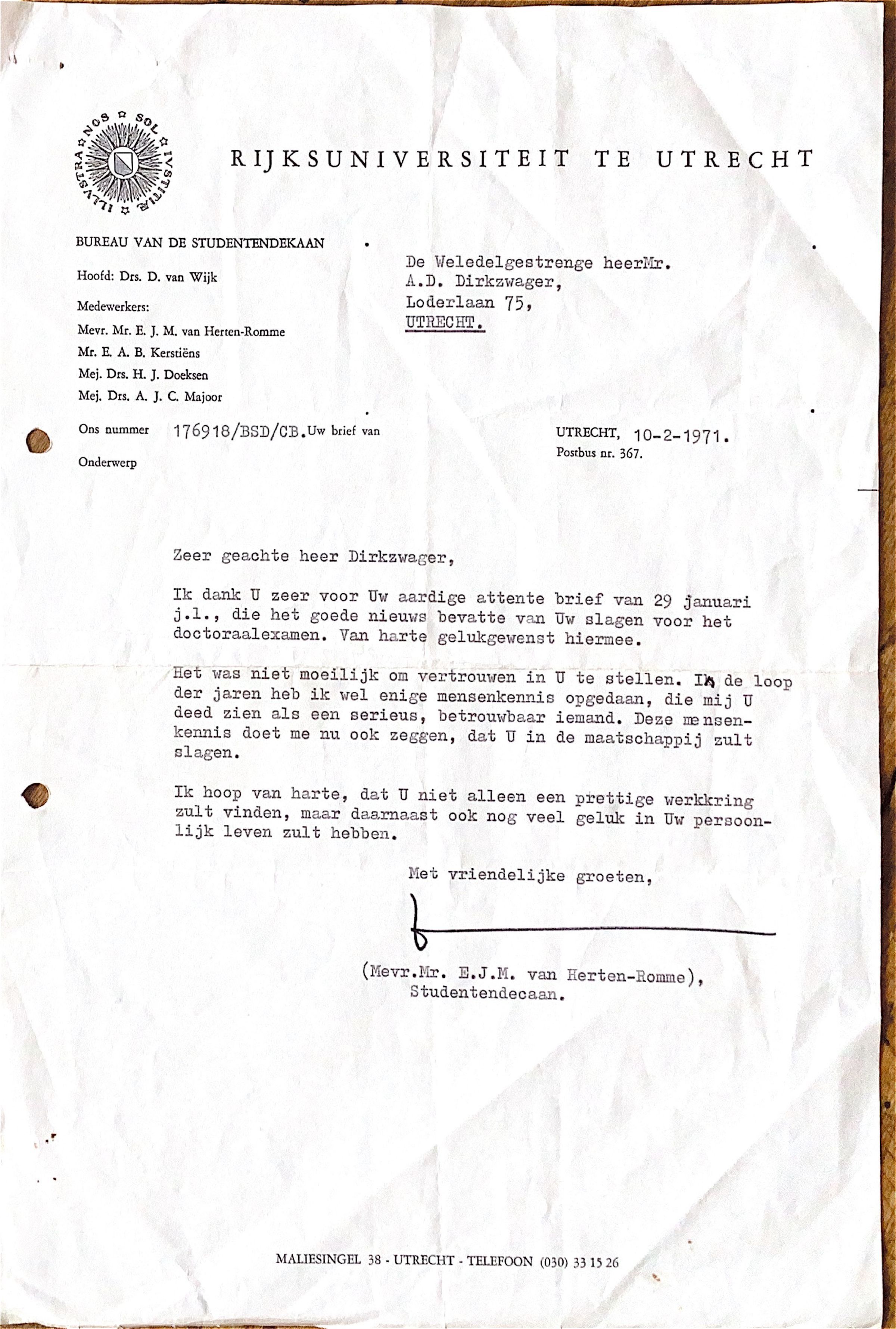 Ik dank u zeer voor uw aardige attente brief van. 29 januari jl., die het goede nieuws bevatte van uw slagen voor het doctoraalexamen. Van harte gelukgewenst hiermee.