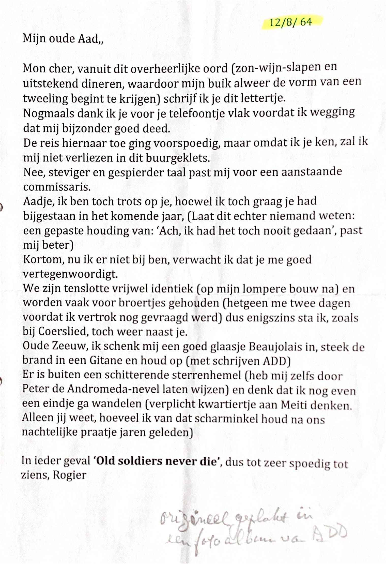 Mon cher, vanuit dit overheerlijke oord (zon, wijn, slapen en uitstekend dineren, waardoor mijn buik alweer de vorm van een tweeling begint te krijgen) schrijf ik je dit briefje. Nogmaals dank ik je voor je telefoontje vlak voordat ik wegging dat mij bijzonder goed deed. De reis hiernaartoe ging voorspoedig, maar omdat ik je ken, zal ik mij niet verliezen in dit buurpraatje. Nee, steviger en gespierder taal past mij voor een aanstaande commissaris. Aadje, ik ben toch trots op je, hoewel ik toch graag je had bijgestaan in het komende jaar, (Laat dit echter niemand weten: een gepaste houding van: 'Ach, ik had het toch nooit gedaan', past mij beter). Kortom, nu ik er niet bij ben, verwacht ik dat je me goed vertegenwoordigt. We zijn tenslotte vrijwel identiek (op mijn lompere bouw na) en worden vaak voor broertjes gehouden (hetgeen me twee dagen voordat ik vertrok nog gevraagd werd) dus enigszins sta ik, zoals bij Coerslied, toch weer naast je. Oude Zeeuw, ik schenk mij een goed glaasje Beaujolais in, steek de brand in een Gitane en houd op (met schrijven ADD). Er is buiten een schitterende sterrenhemel (heb mij zelfs door Peter de Andromeda-nevel laten wijzen) en denk dat ik nog even een eindje ga wandelen (verplicht kwartiertje aan Meiti denken. Alleen jij weet, hoeveel ik van dat scharminkel houd na ons nachtelijke praatje jaren geleden). In ieder geval 'Old soldiers never die', dus tot zeer spoedig tot ziens,