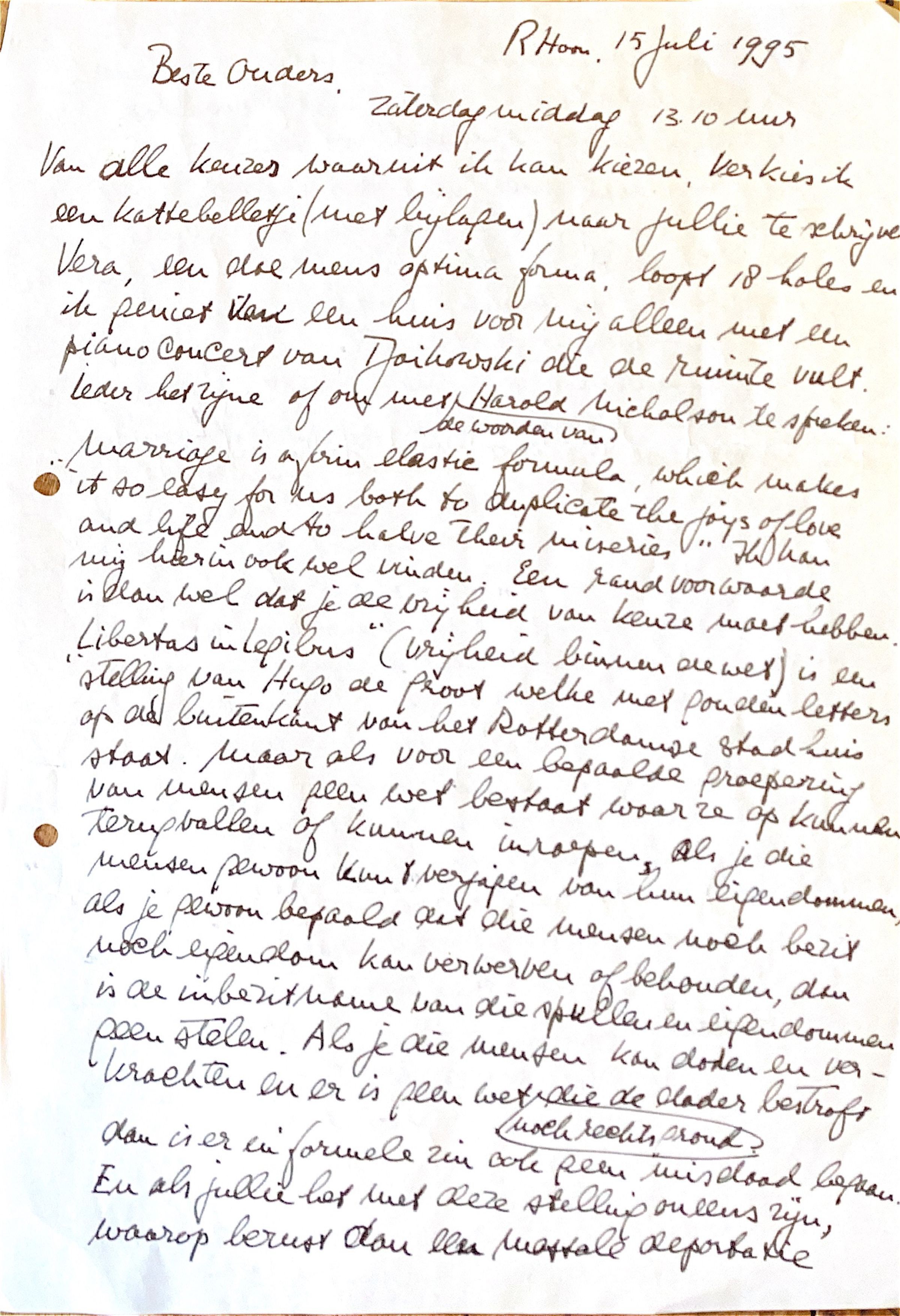 van alle keuzes waaruit ik kan kiezen, verkies ik om een kattebelletje (met bijlagen) aan jullie te schrijven. Vera, een doe-mens in optima forma, loopt 18 holes op een golf-cours en ik geniet van een huis voor mij alleen met een pianoconcert van Tsjaikovski, dat mij inspireert bij het schrijven.