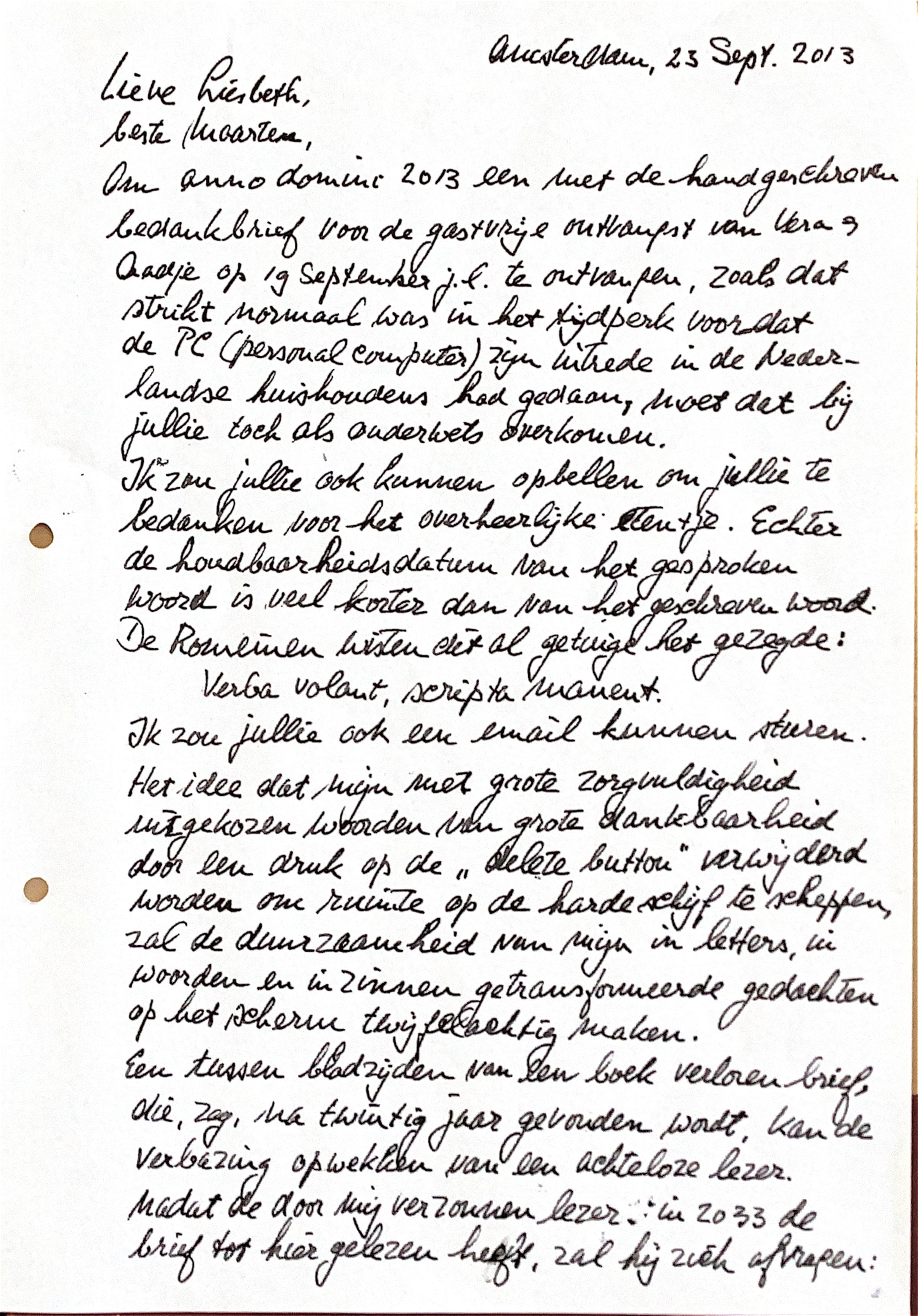 2013-09-23 Een “Bread and butter” brief aan Liesbeth & Maarten Frankenhuis voor het overheerlijke etentje op 19 sept. 2023.