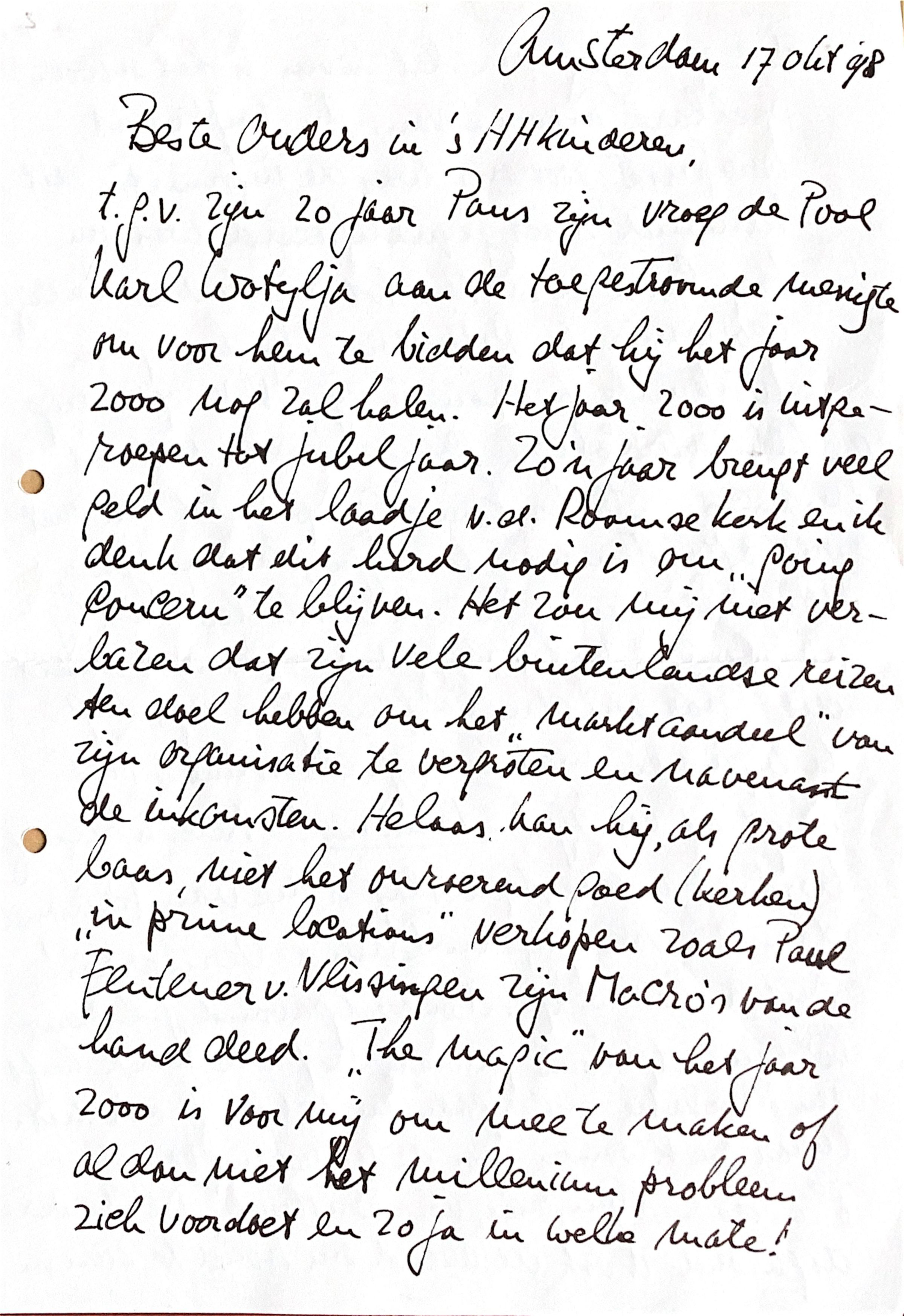 Ter gelegenheid van zijn 20 jaar Paus zijn, vroeg de Pool Karl Wotylja aan de toegestroomde menigte om voor hem te bidden dat hij het jaar 2000 bij leven en welzijn nog zal meemaken. Het jaar 2000 is uitgeroepen tot Jubeljaar van de Rooms Katholieke kerk. Zo'n jaar brengt veel geld in het laadje van de Roomse kerk. en ik meen dat dit hard nodig is om "going concern" te blijven. Het zou mij niet verbazen dat zijn vele buitenlandse reizen ten doel hebben om het marktaandeel te vergroten en navenant de inkomsten. Helaas kan hij niet, als grote baas, het onroerend goed (bijvoorbeeld kerken)