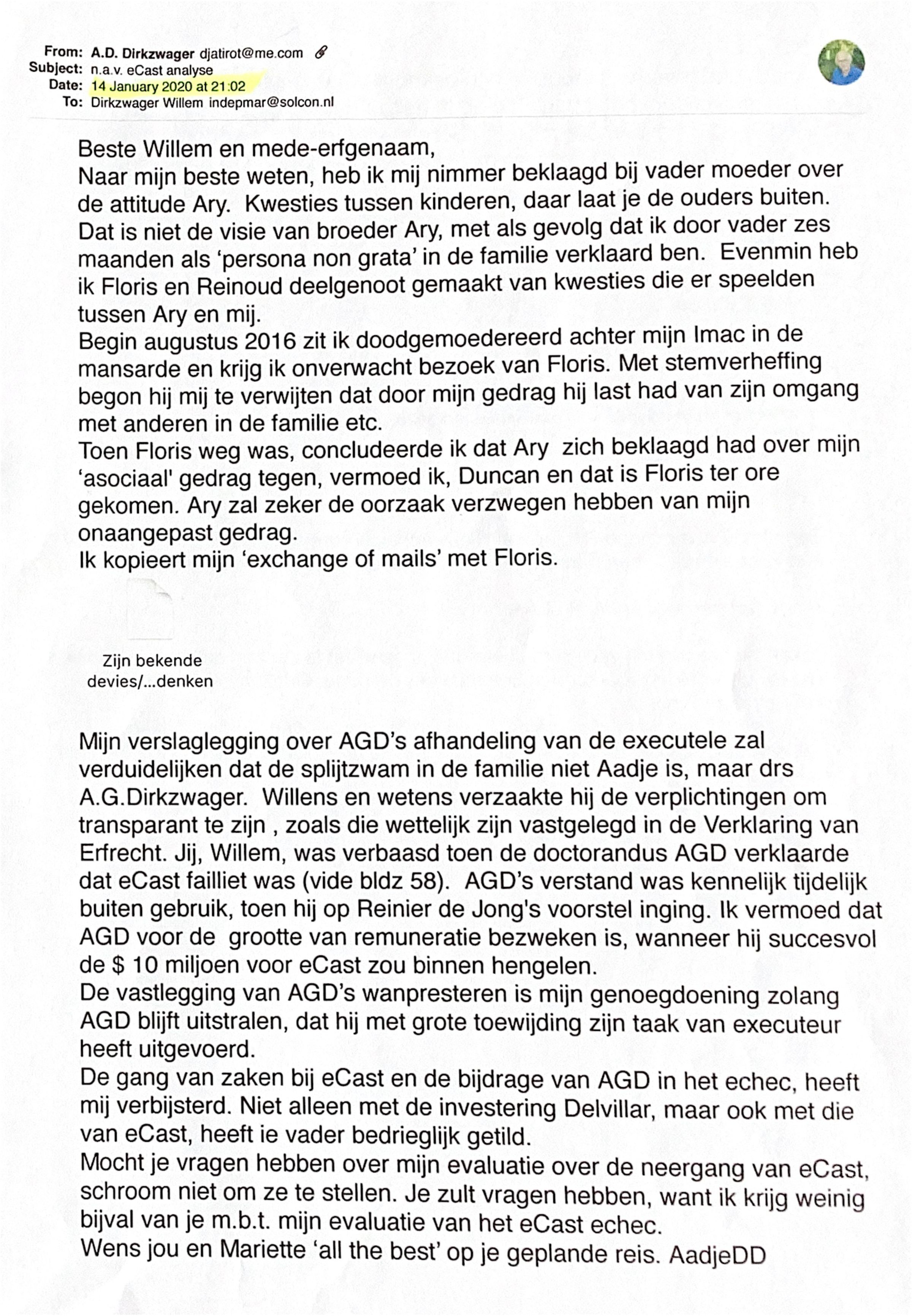 2020-01-14 Mail aan mede -erfgenaam Willem Dirkzwager.