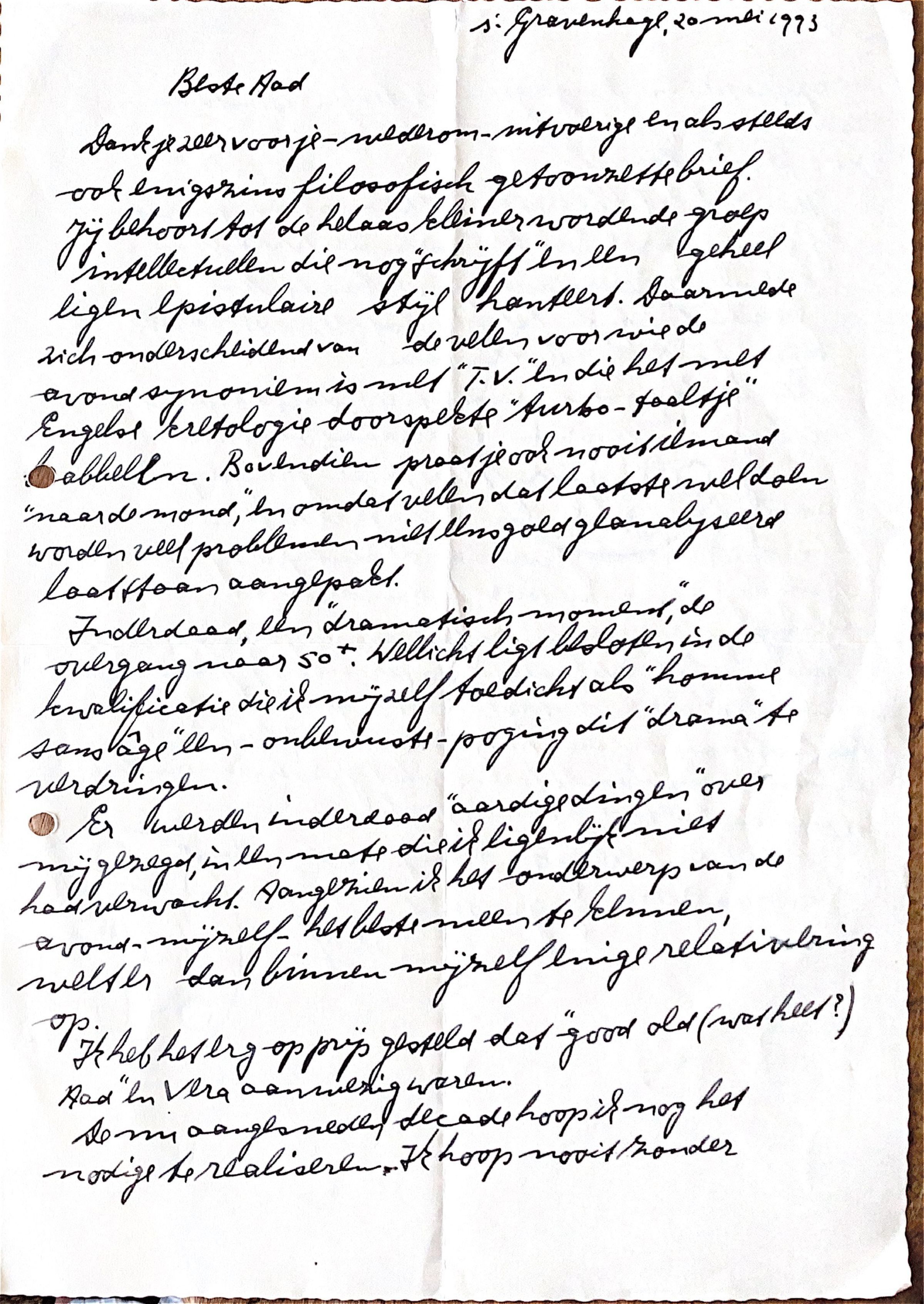 dank je voor je -wederom-uitvoerige en als steeds ook enigszins fliosofisch getoonzette brief. Jij behoort tot de helaas kleiner wordende groep intellectuelen, die nog schrijft en een geheel eigen epistolaire stijl hanteert. Daarmede zich onderscheidend van de velen, voor wie de avond synoniem is met T.V. en die met Engelse kretologie doorspekt turbo taaltje brabbelen.