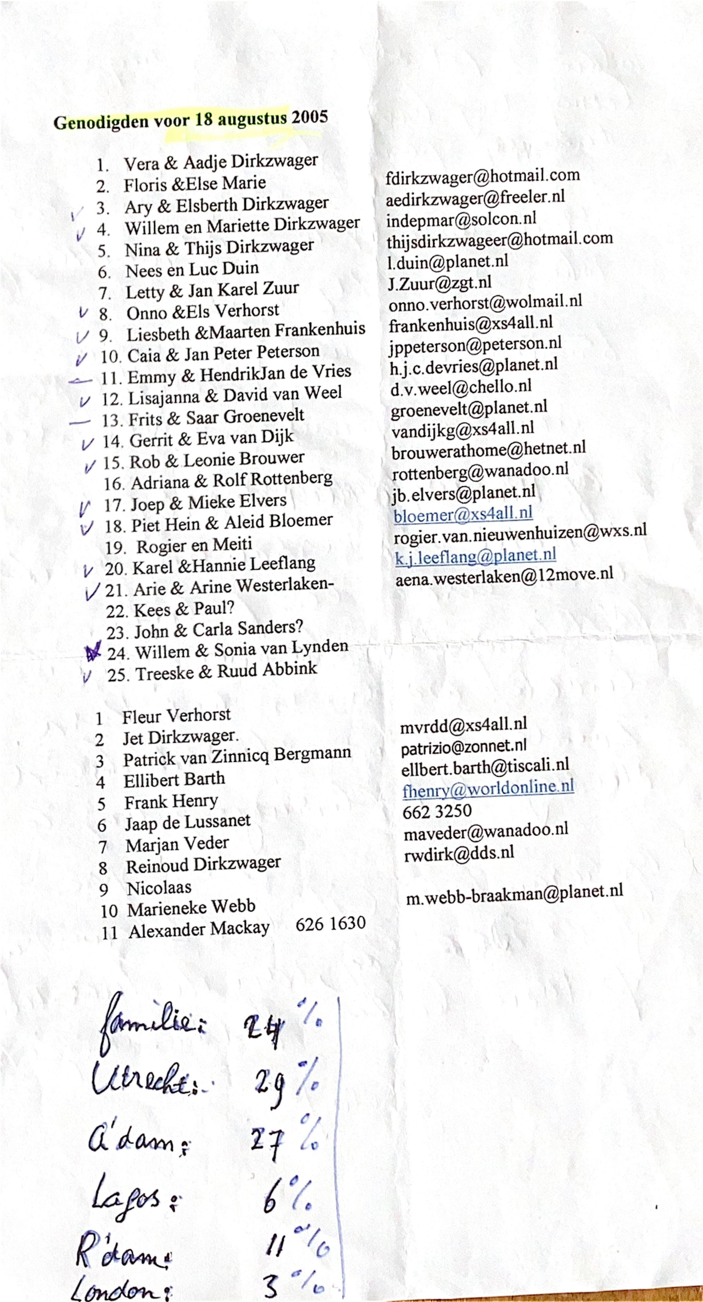 2005-08-18 Lijst van genodigden voor Aadjes 65 jaar partij.