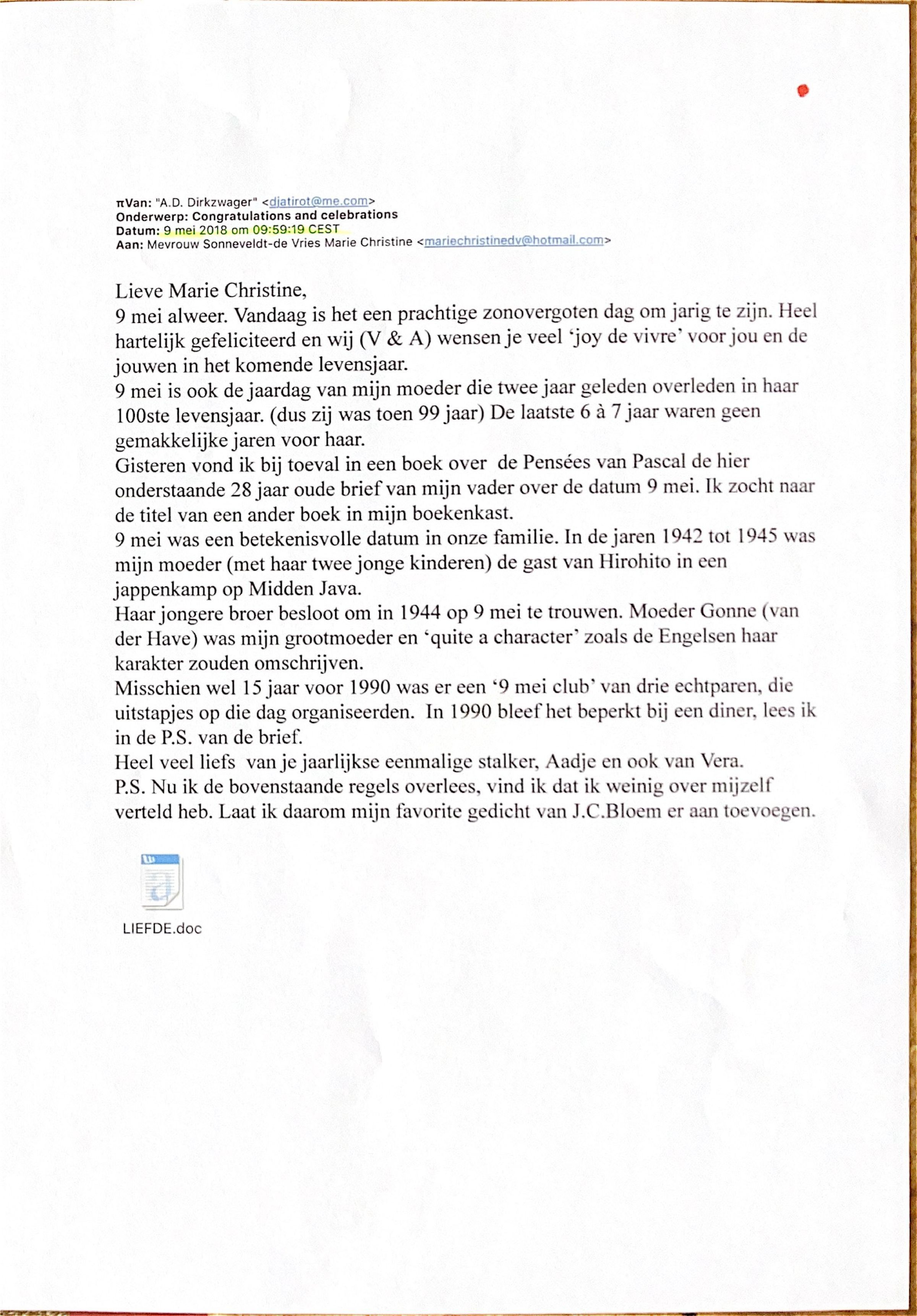 2018-05-09 Verjaardagsmail aan Marie Christine de Vries.