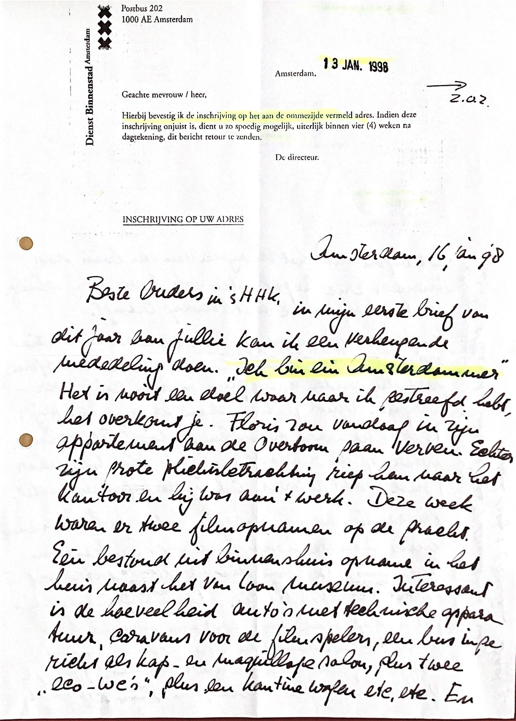 Hierbij bevestig ik de inschrijving (in het gemeentelijk register, ADD) aan het ommezijde vermelde adres (Keizersgracht 702 D; ADD) etc.