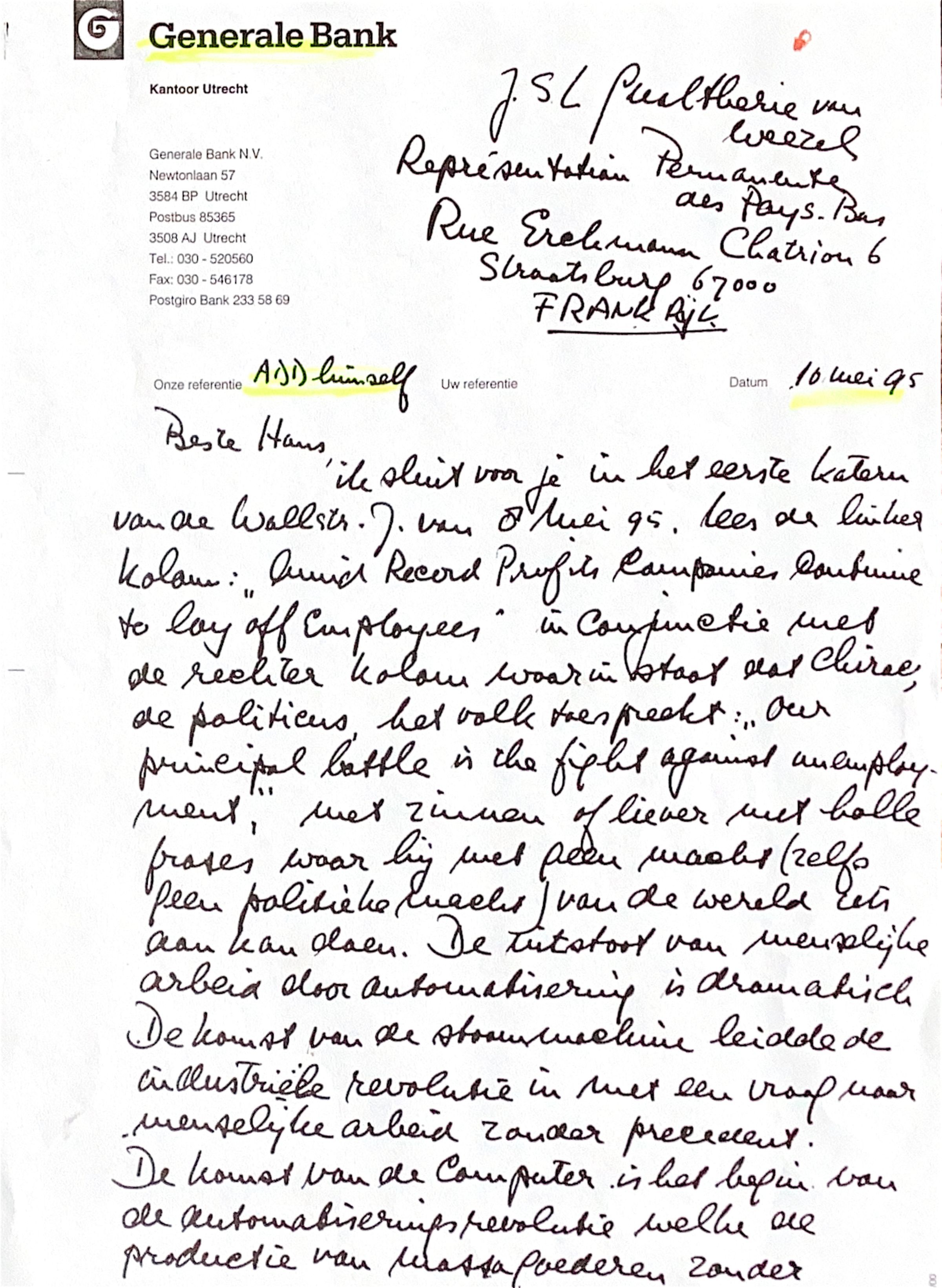 ik sluit in de enveloppe voor jou het eerste katern van de Wallstreet Journey d.d. 8 mei 1995. Lees de linker kolom: " Amid record Profits Companies continue to lay off employees" in conjuntie met de rechter kolom, waarin staat dat de politicus Chirac het volk toespreekt: "Our principle battle is the fight against unemployment", met zinnen of nauwkeuriger met holle frases, waar hij met geen macht (zelfs geen politieke macht) van de wereld iets aan doen kan.