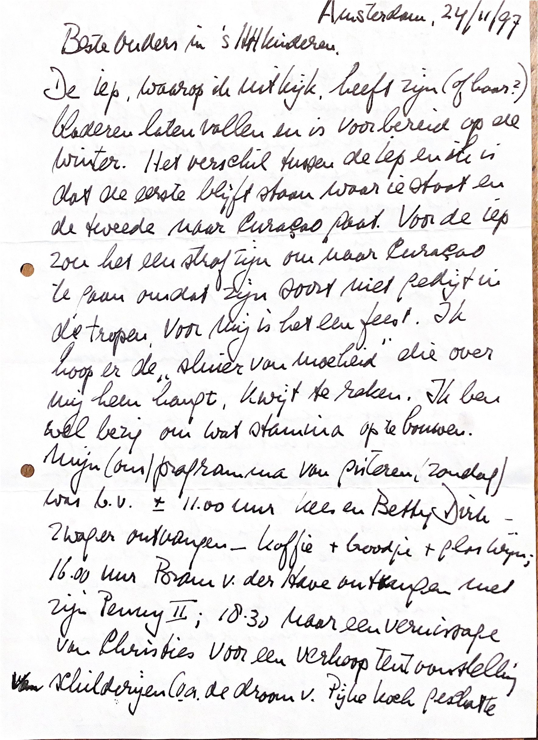 Mijn (ons) programma van gisteren (zondag) b.v. ± 11.00 uur am Kees & Betty Dirkzwager ontvangen met koffie +broodje +een glas wijn; om 16.00 uur Bram van der Have ontvangen met zijn Penny II; om 18,30 uur naar een vernissage van Christies/Amsterdam voor een verkooptentoonstelling van schilderijen, waaronder het schilderij "de Droom" van Pijke Koch met een geschatte waarde Nlg 140.000 à Nlg 160.000. (niets gekocht of beter uitgelegd, wilde niets kopen) ook zilver en juwelen zouden geveild worden. We zijn niet hebberig, dus wij zijn de verkeerd soort klanten voor Christies. Daarna "I called it a day."