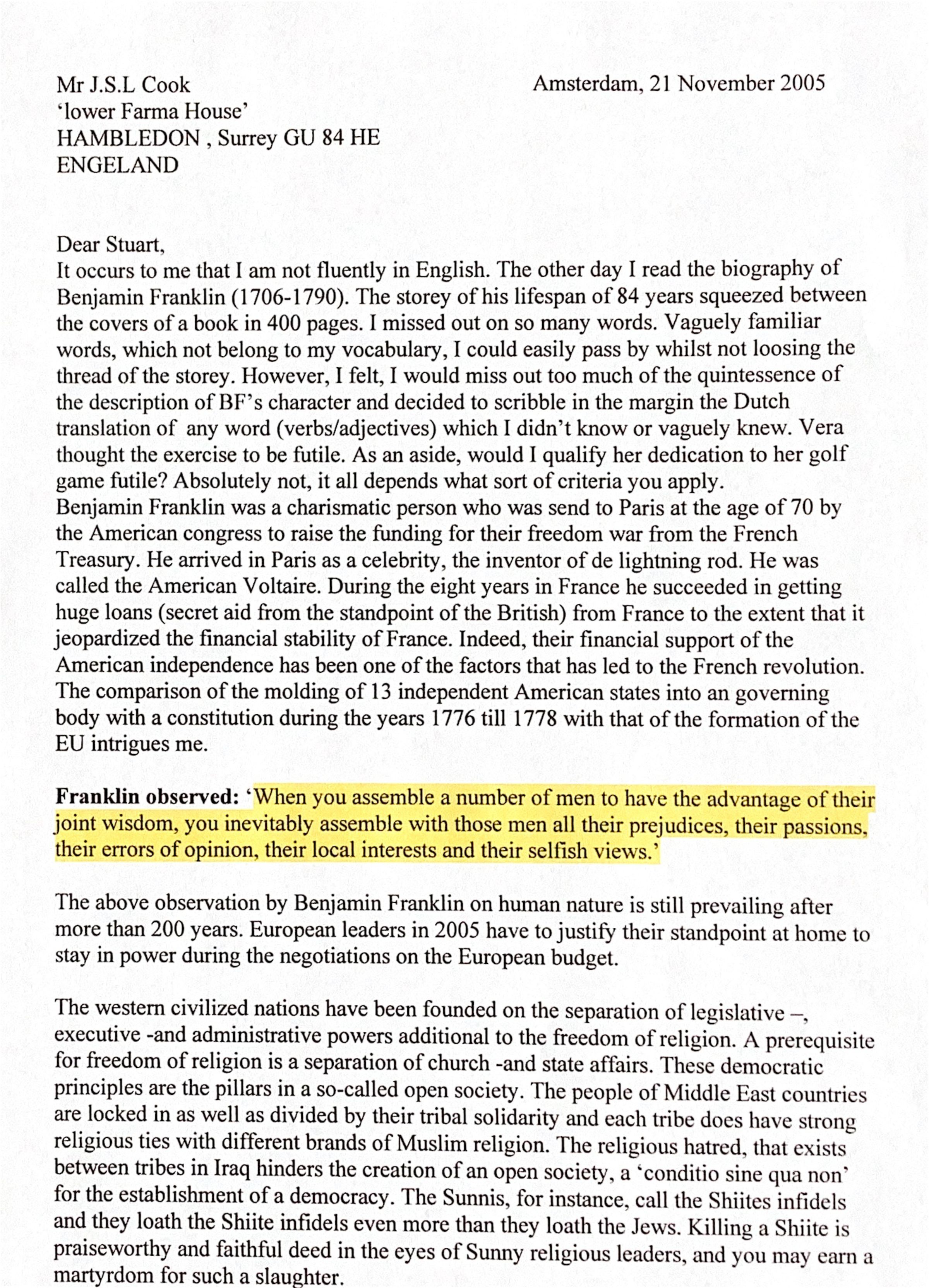 2005-11-21 a letter to Stuart Cook about Benjamin Franklin and about Putin’s visit to the Netherlands.