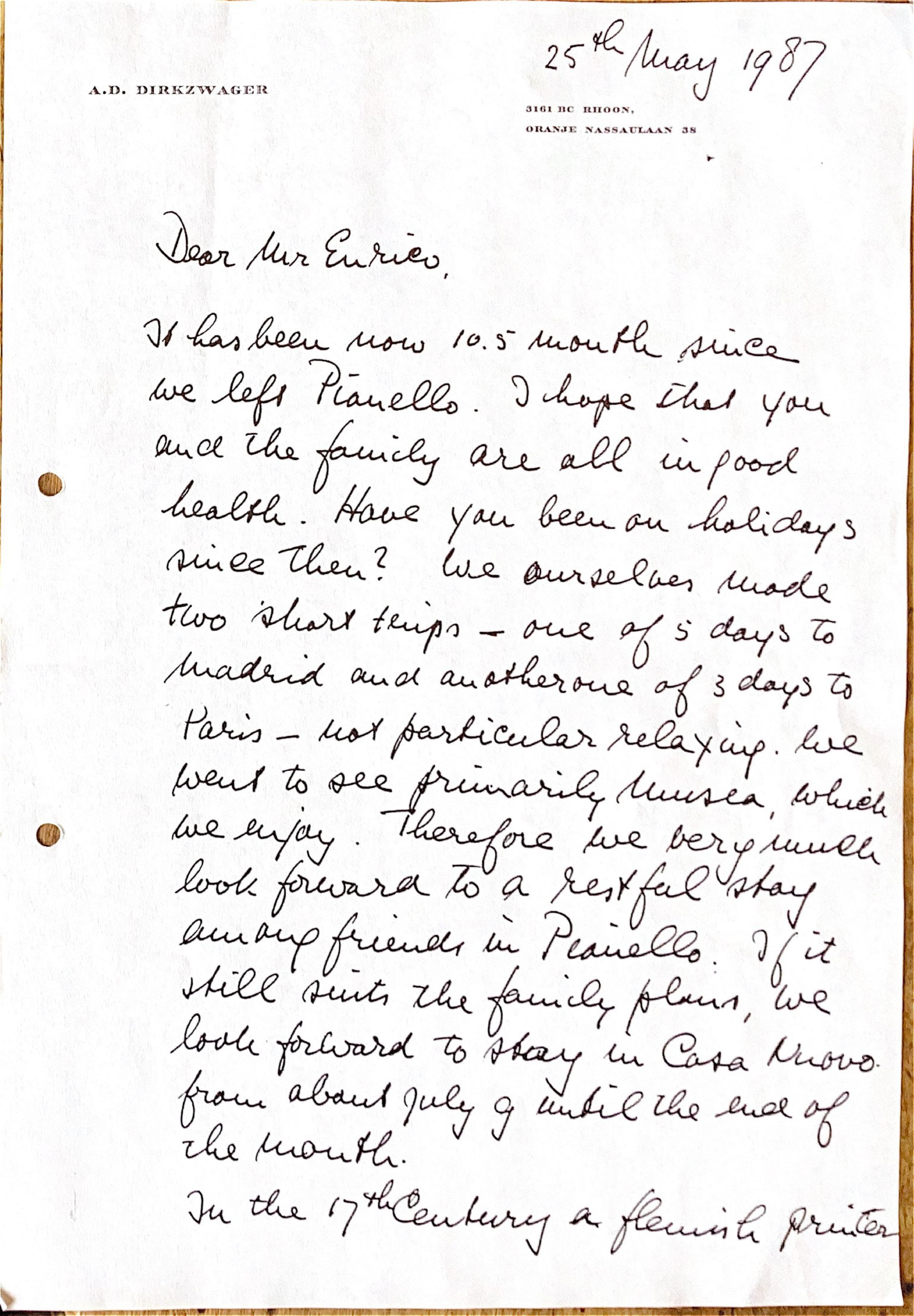 1987-05-25 Brief ADD aan Enrico Segre om in juli naar Pianello te gaan.