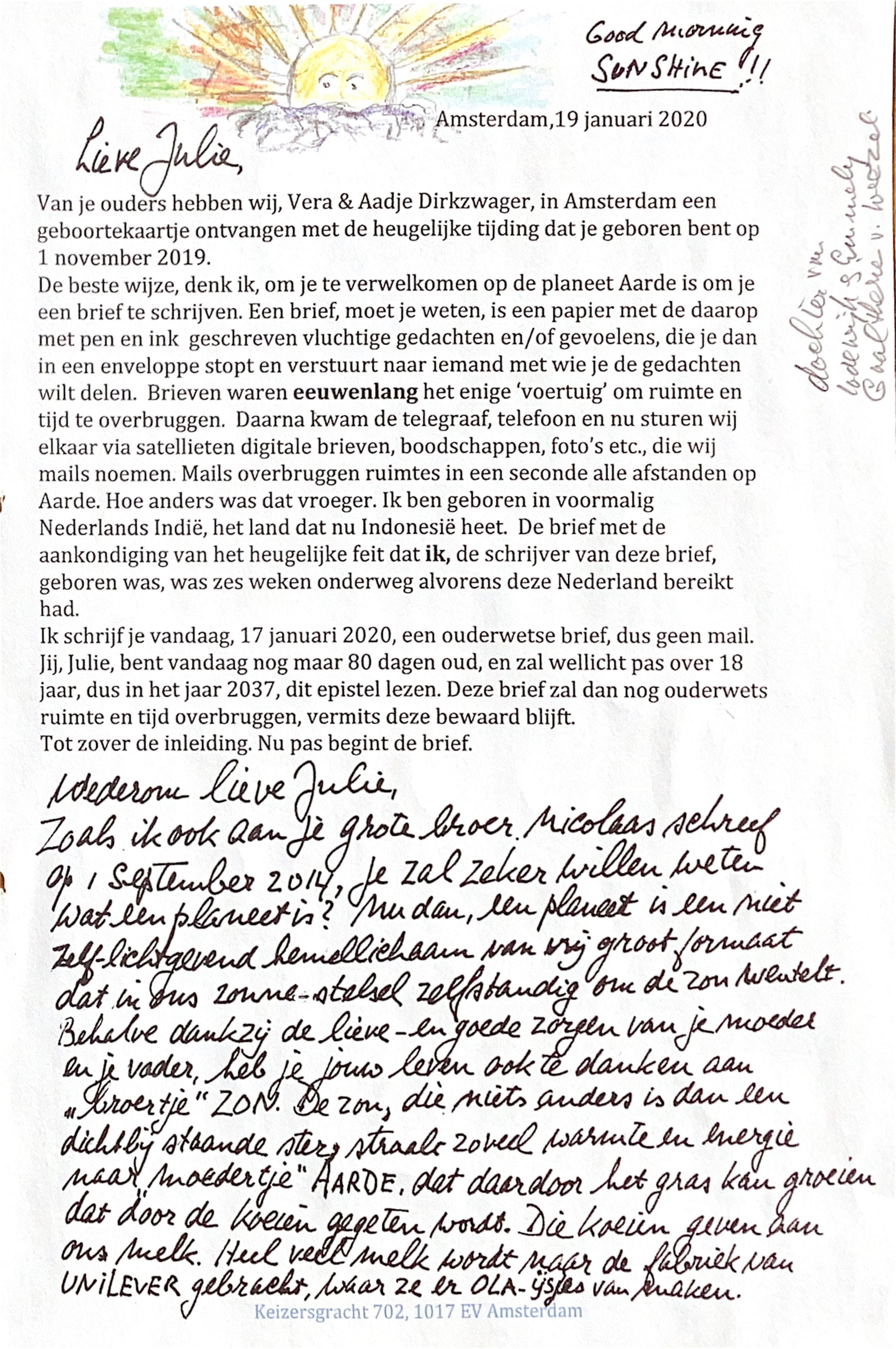 Jij, Julie, bent vandaag nog maar 80 dagen oud, en zal wllicht pas over 18 jaar, dus in het jaar 2037, dit epistel lezen. Deze brief zal dan nog ouderwets ruimte en tijd ovedrbruggen, vermits deze bewaard blijft.