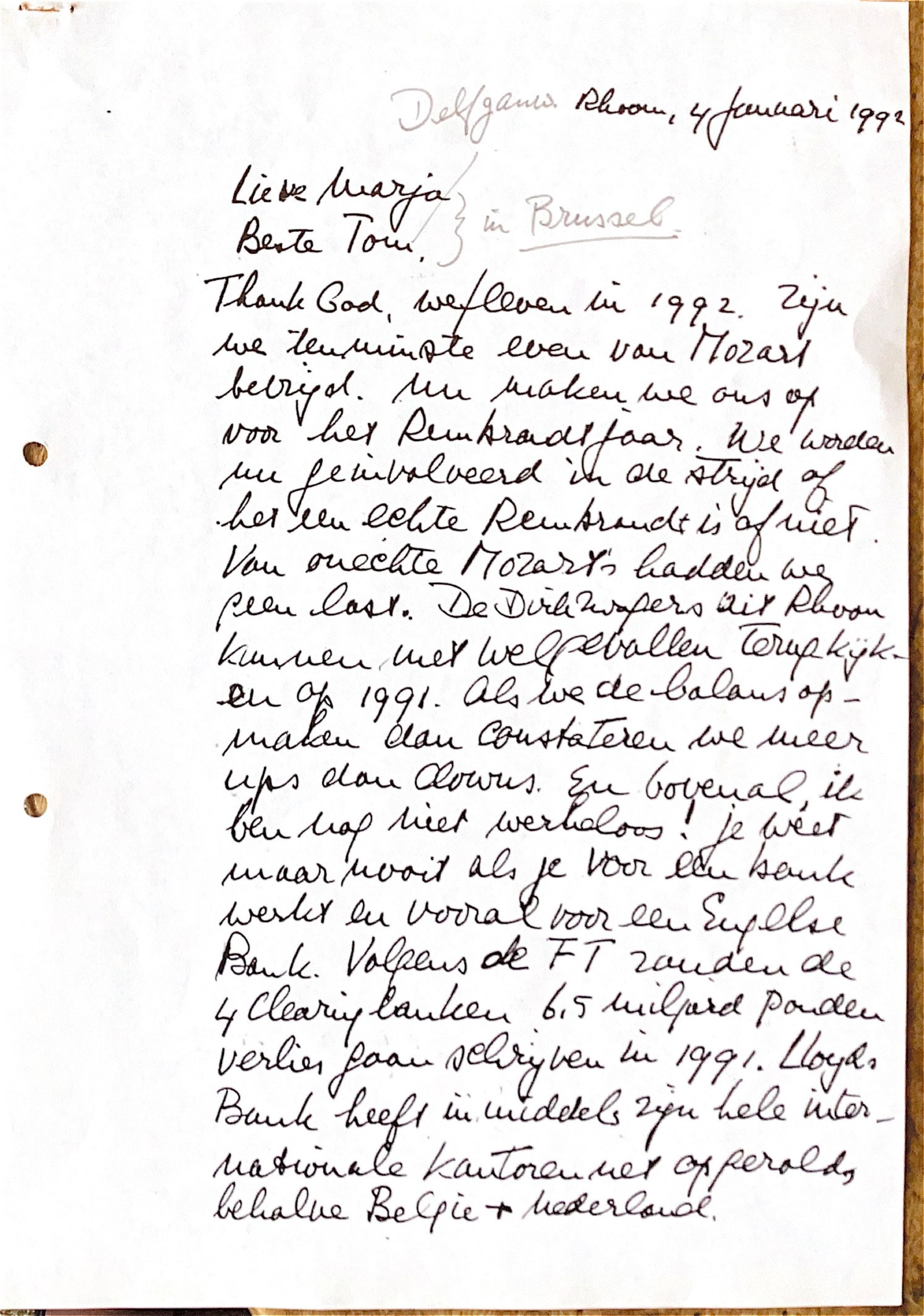 De Dirkzwagers uit Rhoon kunnen met welgevallen terugkijken op het jaar 1991. Als we de balans opmaken, dan constateren wij meer "ups than downs". En bovenal ik ben nog niet werkeloos ! Je weet maar nooit als je voor een Bank werkt en vooral een Engelse Bank. Volgens the Financial Times zouden de vier "Clearing Banks in London" GBS 6.5 miljard verlies gaan schrijven in 1991.