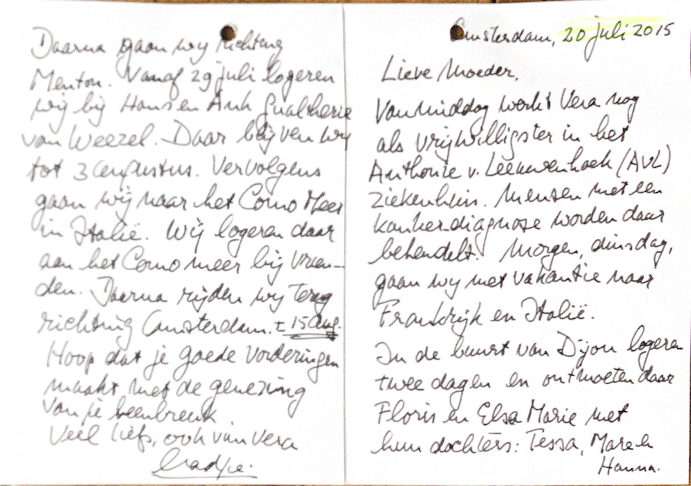2015-07-20 Briefkaart aan moeder in Geersdijk om onze whereabouts haar te laten wegen.