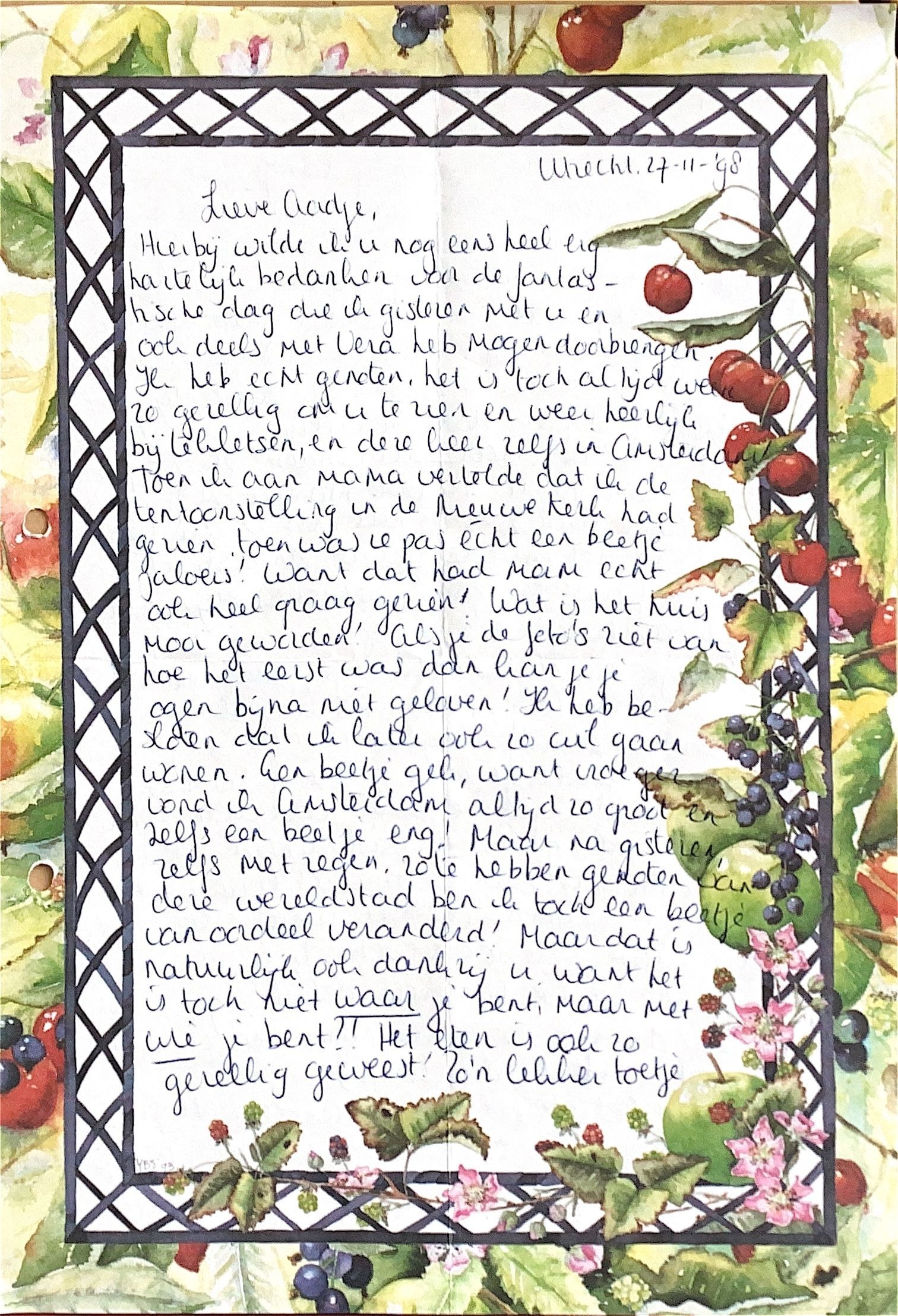 Lieve Aadje, Hartelijke dank nogmaals voor de fantastische gezellige dag. Misschein kan ik wel een stukje over de tentoonstelling schrijven voor de volgend VOX! Dank voor het gezellige eten en de fascinerende gesprekken, Verder nog bedankt voor de computerles en alle andere gezelligheid en gastvrijheid. Heel veel liefs en dank ook aan Vera. Het was leuk om haar ook weer gezien te hebben !