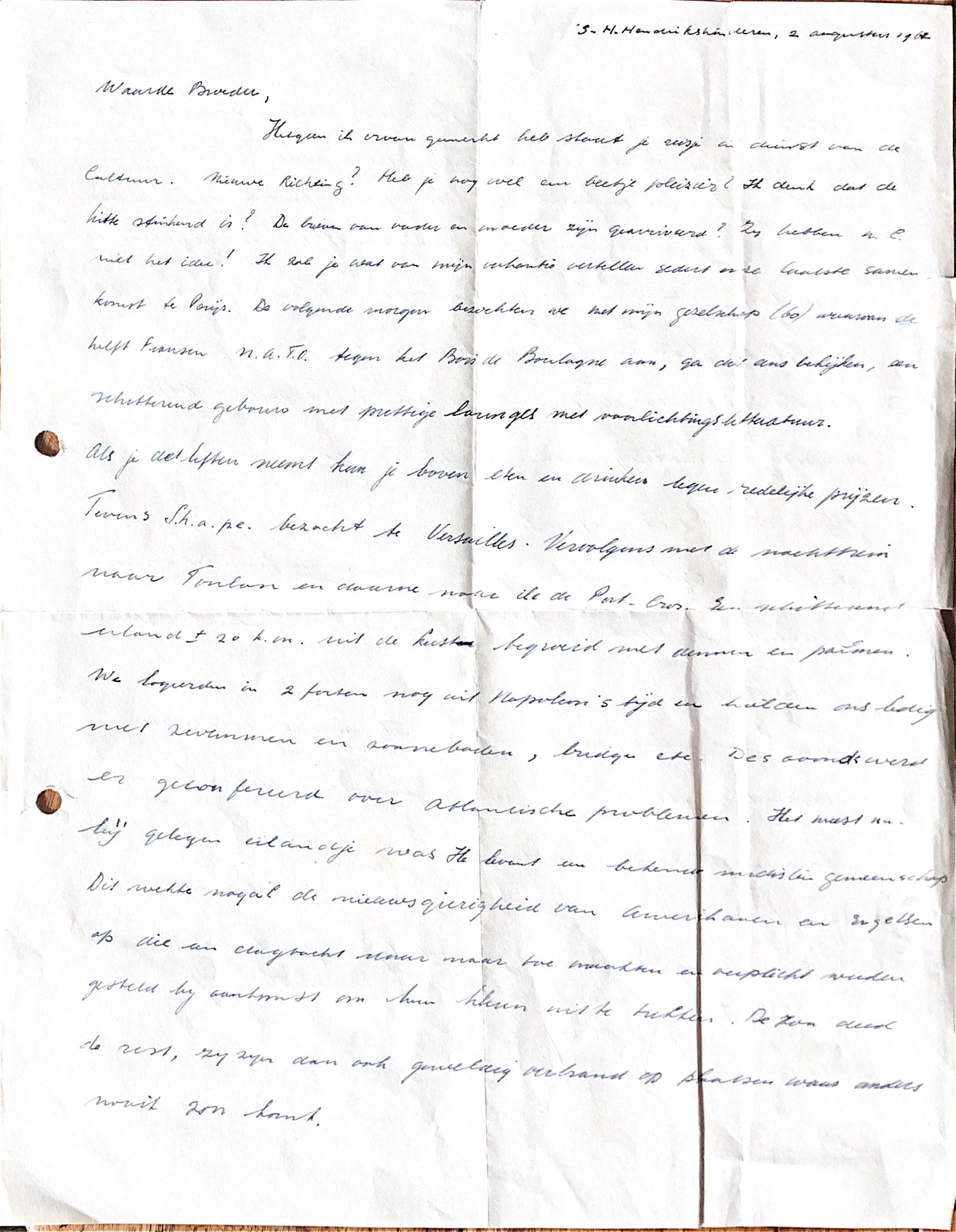 Ik zal je wat van mijn vakantie vertellen sinds onze laatste samenkomst in Parijs. De volgende morgen bezochten we met mijn gezelschap (60), waarvan de helft Fransen, NATO tegen het Bois de Boulogne aan. Ga dat eens bekijken, een schitterend gebouw met prettige lounges met voorlichtingsliteratuur. Als je de liften neemt kun je boven eten en drinken tegen redelijke prijzen. Tevens S.H.A.P.E. bezocht te Versailles.
