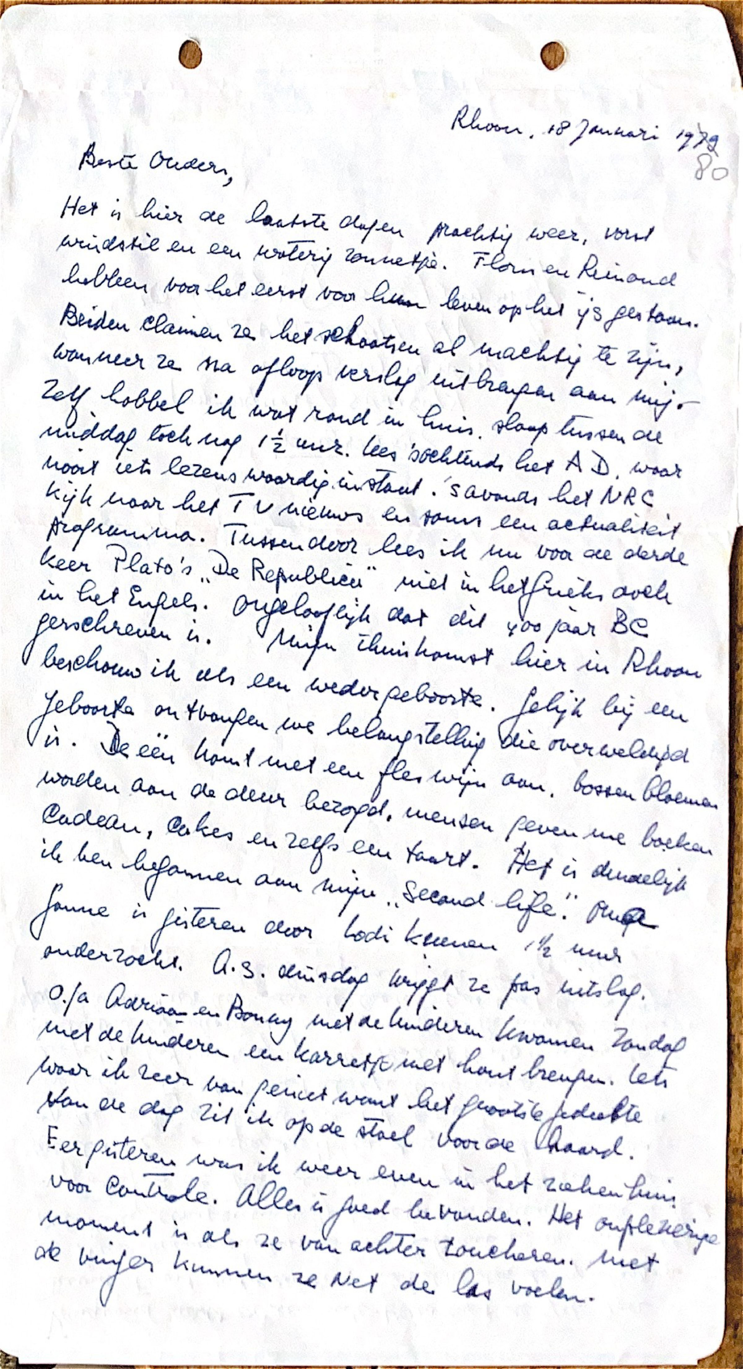 Zelf hobbel ik wat rond in het huis. Slaap tussen de middag toch nog 11/2 uur. Lees 's-Ochtends het AD (Algemeen Dagblad; ADD), waar nooit iets lezenswaardig in staat. 's-Avonds het NRC, kijk naar het TV-nieuws en soms naar een actualiteit's documentaire.Tussendoor lees ik voor de derde keer Plato' s "De Republic" niet in het Grieks doch in het Engels. Ongelooflijk dat dit 400 jaar BC geschreven is.