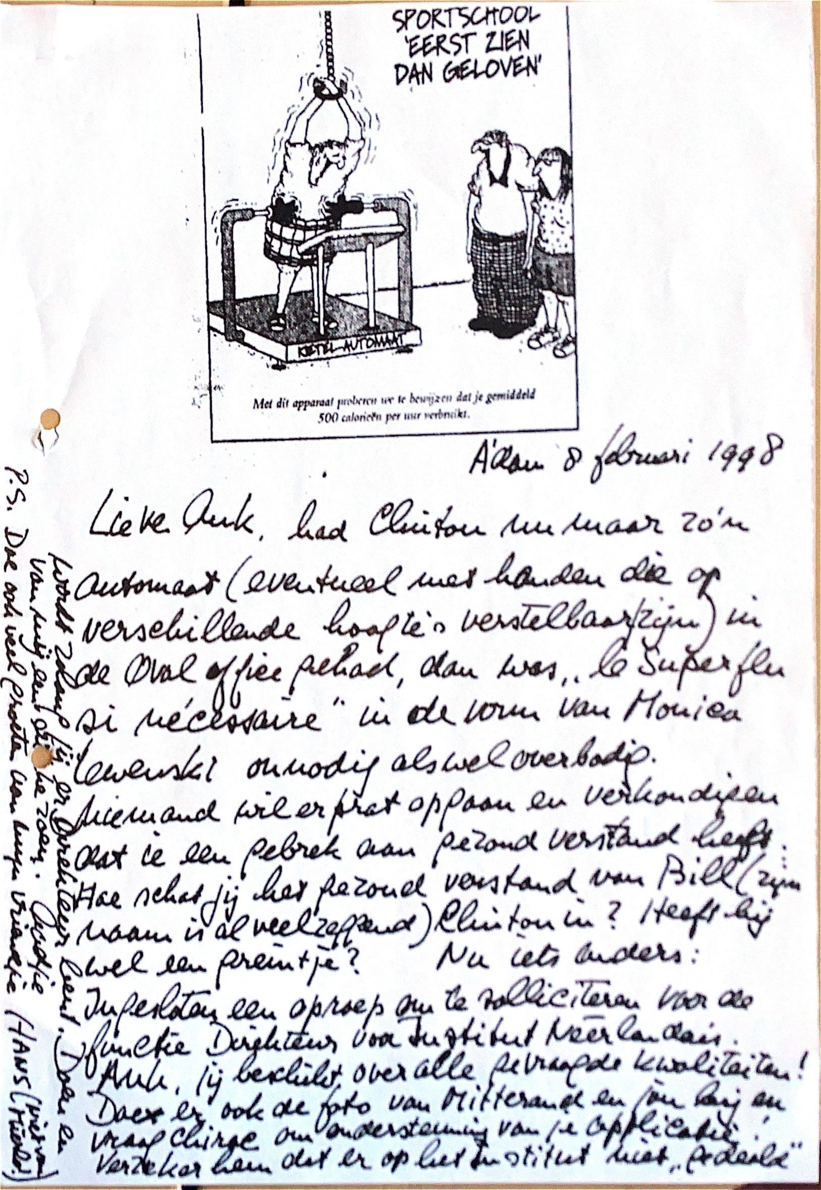 Ingesloten in de envelop een oproep om te solliciteren voor de functie Directeur "Insttut Néerlandais". Ank, jij beschikt over alle gevraagde kwaliteiten ! Doe bij je sollicitatie ook de foto van Mitterand en jou bij en vraag Chirac om ondersteuning van je applicatie ! Verzeker hemdat er op het "Institut" niet gedeald" wordt zolang jij er directeur bent. Doen en van mij een dikke zoen, Aadje