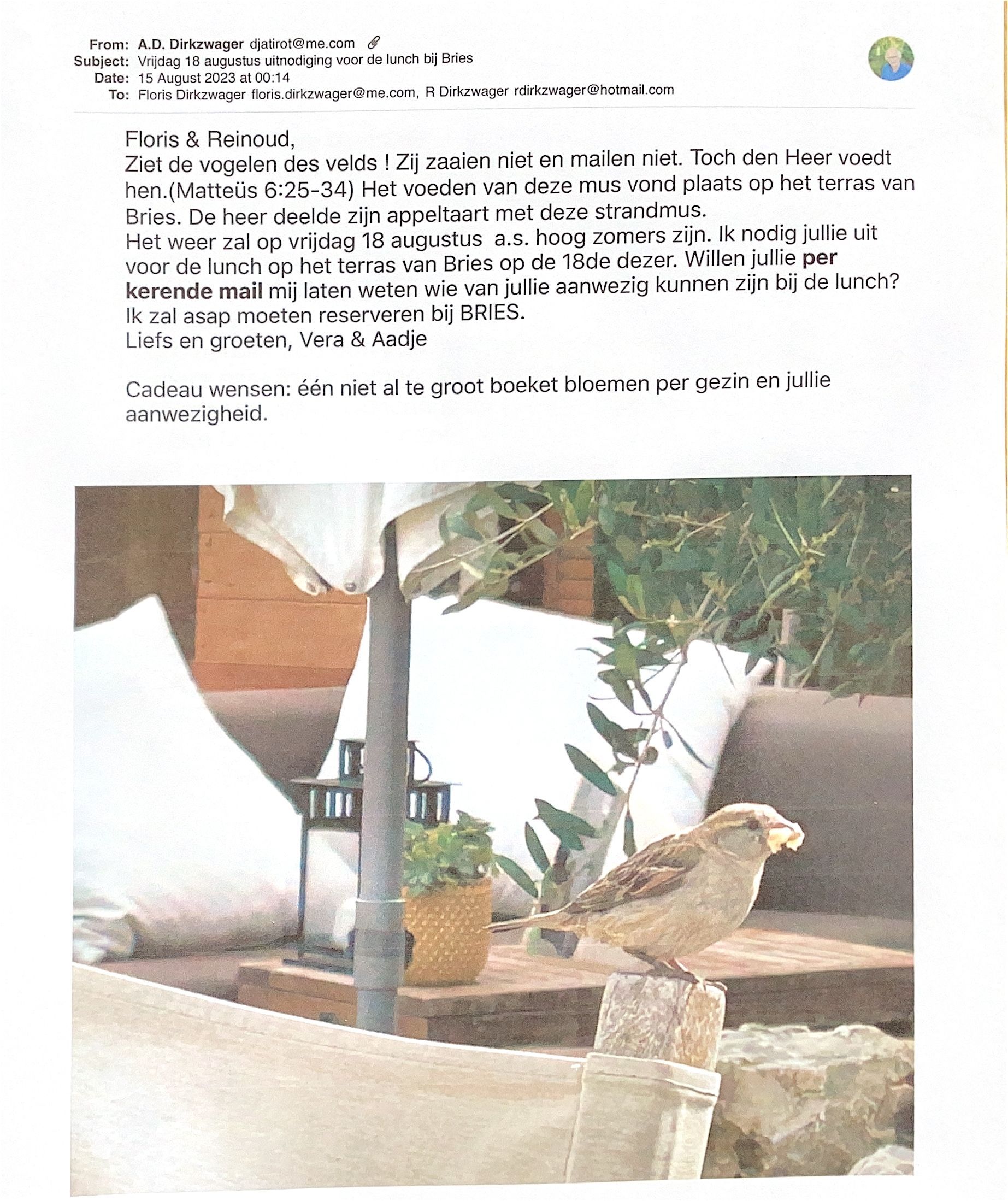 2023-08-15 Uitnodiging voor een lunch in de strandtent Bries t.g.v. Aadje’s bereiken van zijn 83 jarige leefttijd.