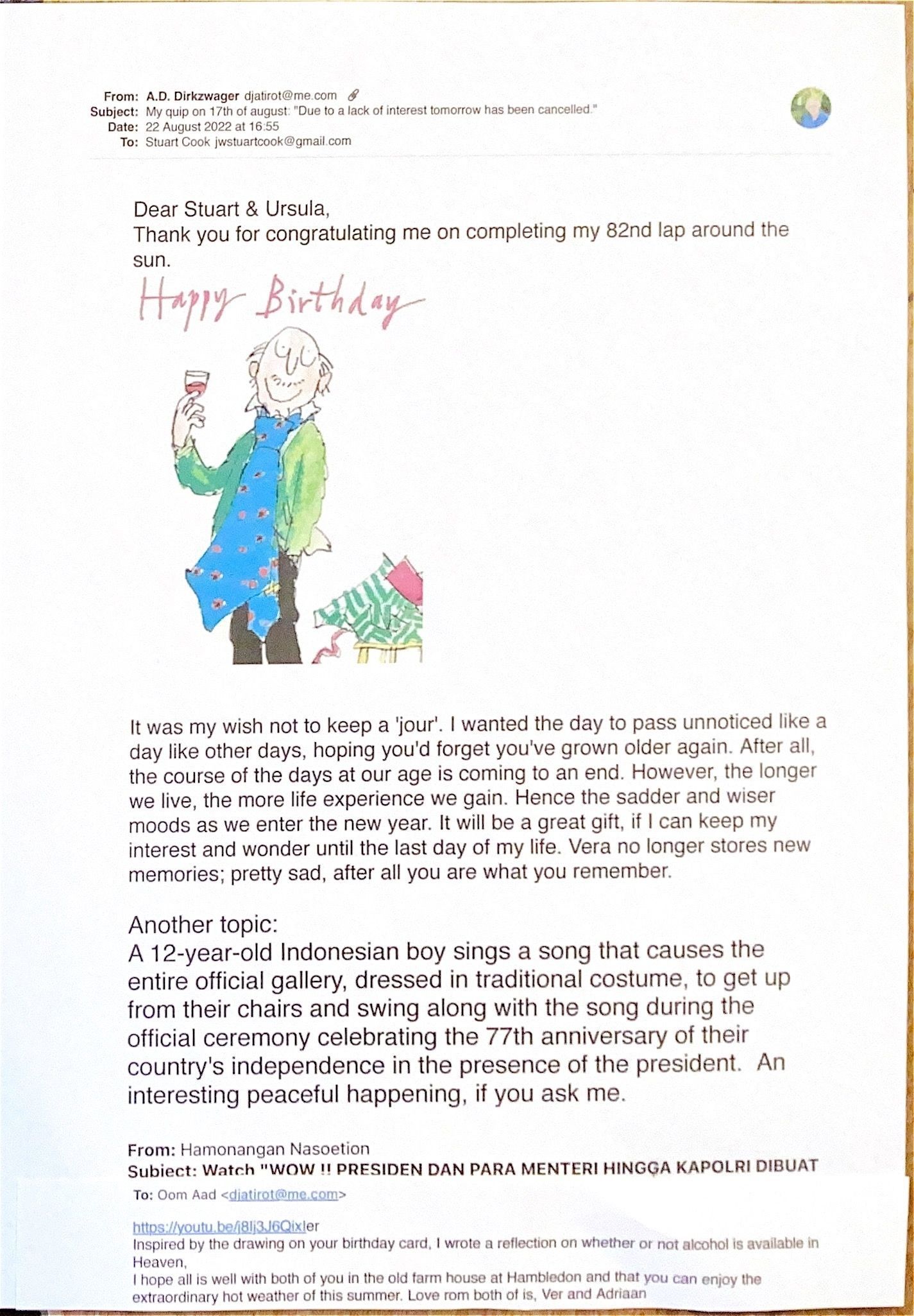 It was not my desire to hold 'jour'. I wanted the day to pass unnoticed like any other day, hoping that you would forget that you were getting older again. After all, the days at our age are coming to an end.