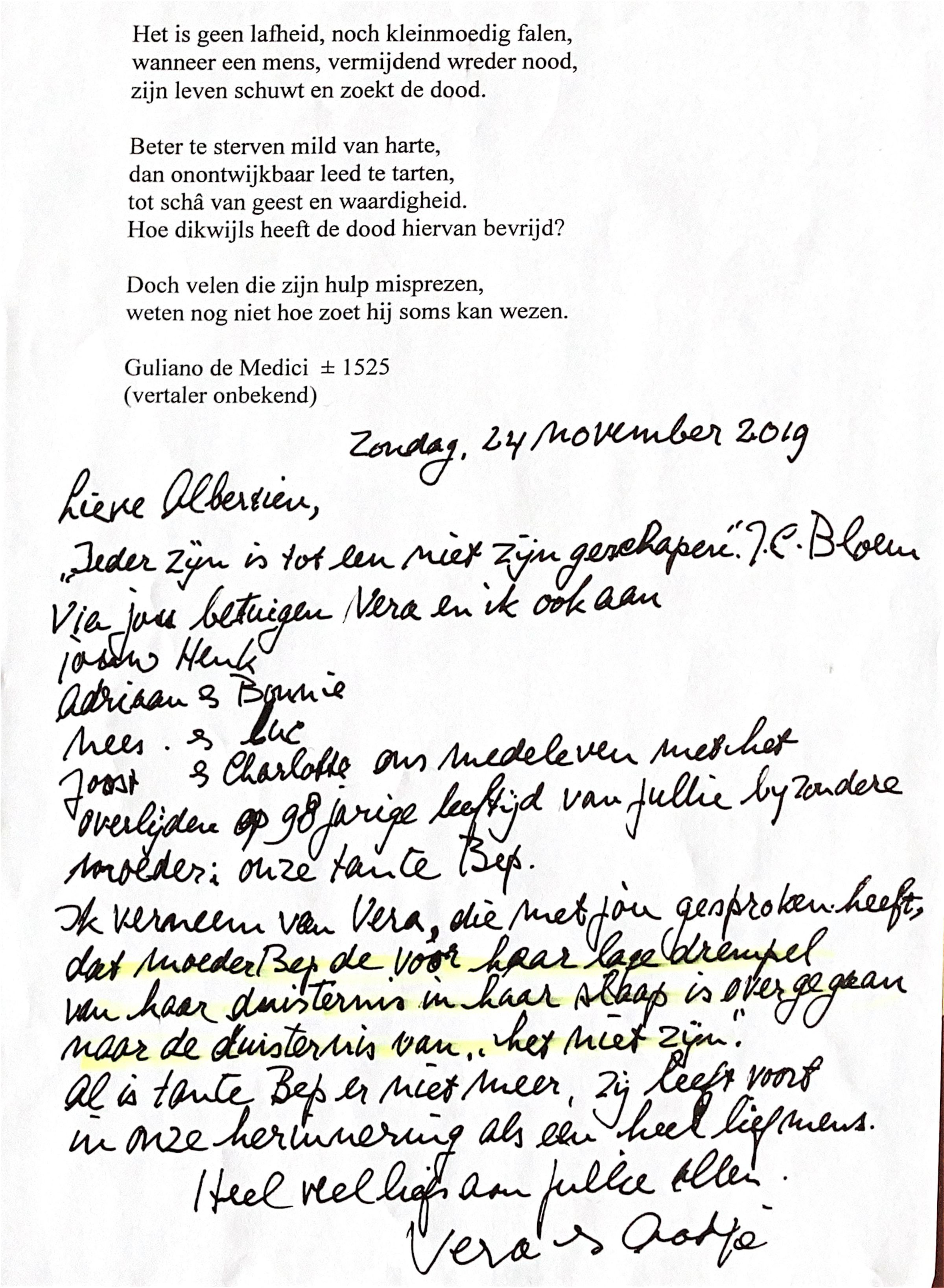 Ik verneem van Vera, die met jou gesproken heeft, dat Moeder Bep de voor haar lage drempel van haar duisternis in haar slaap, is overgegaan naar de duisternis "van het niet zijn".