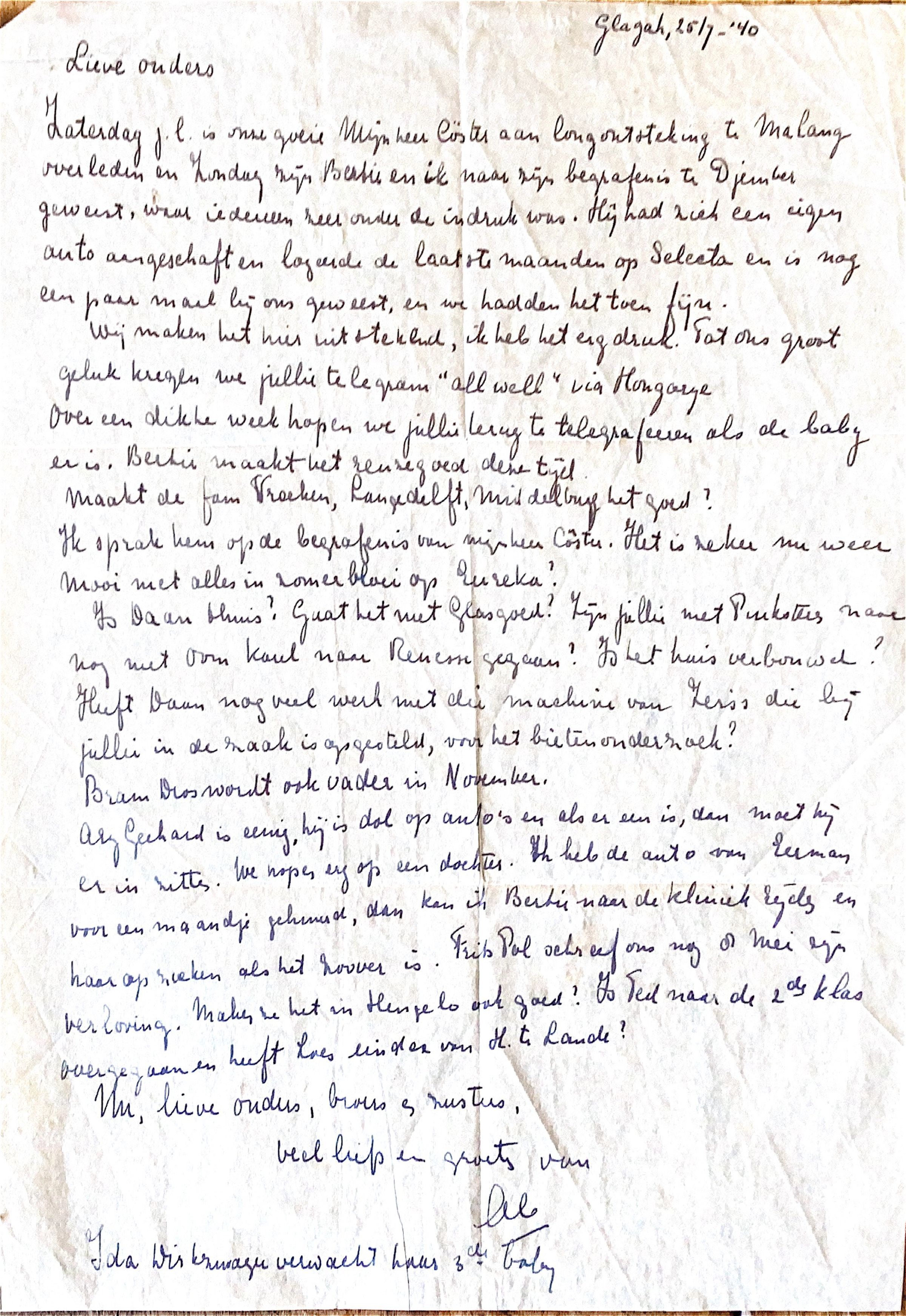 Zaterdag j.l. is onze goede Mijnheer Cöster aan longontsteking te Malang overleden en zondag zijn Bertie en ik naar zijn begrafenis te Djember geweest, waar iedereen zeer onder de indruk was. Hij had zich een eigen auto aangeschaft en verbleef de laatste maanden op Selecta en is nog een paar keer bij ons geweest, en we hadden het toen fijn. De geboorte van Adriaan Daniel vond plaats op 18 augustusWij maken het hier uitstekend, al heb ik het erg druk. Tot ons grote geluk kregen we jullie telegram "all well" via Hongarye. Over een dikke week hopen we jullie terug te kunnen telegraferen als de baby (i.e. Adriaan Daniël) er is. Bertie maakt het reuze goed deze tijd.