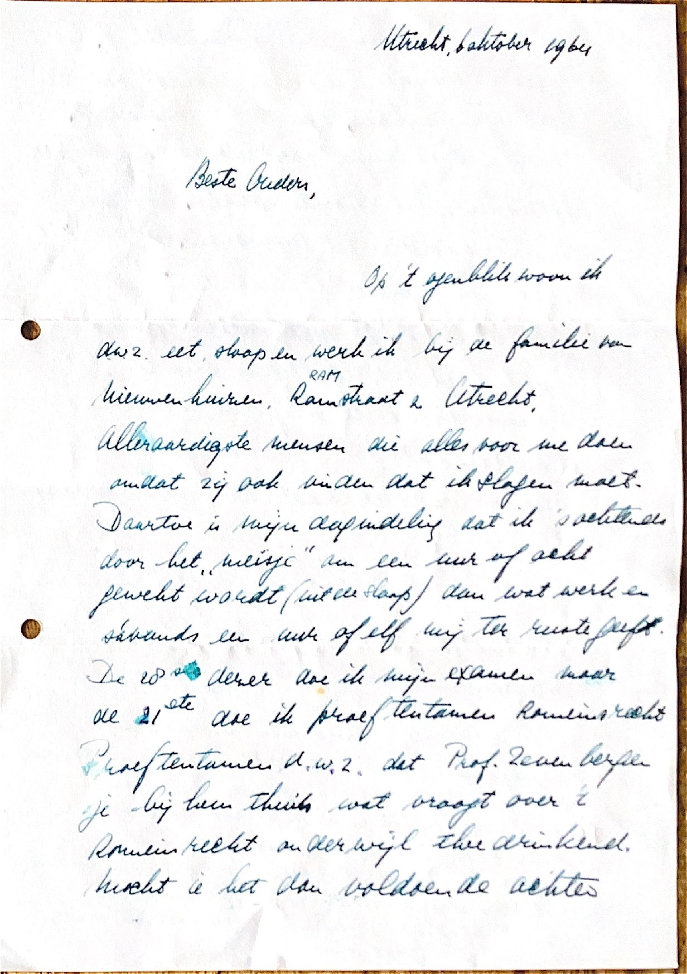 Op 't ogenblik woon ik d.w.z eet, slaap en werk ik bij de familie van Nieuwenhuizen, Ramstraat 2 Utrecht. Alleraardigste mensen die alles voor me doen, omdat zij ook vinden dat ik slagen moet.