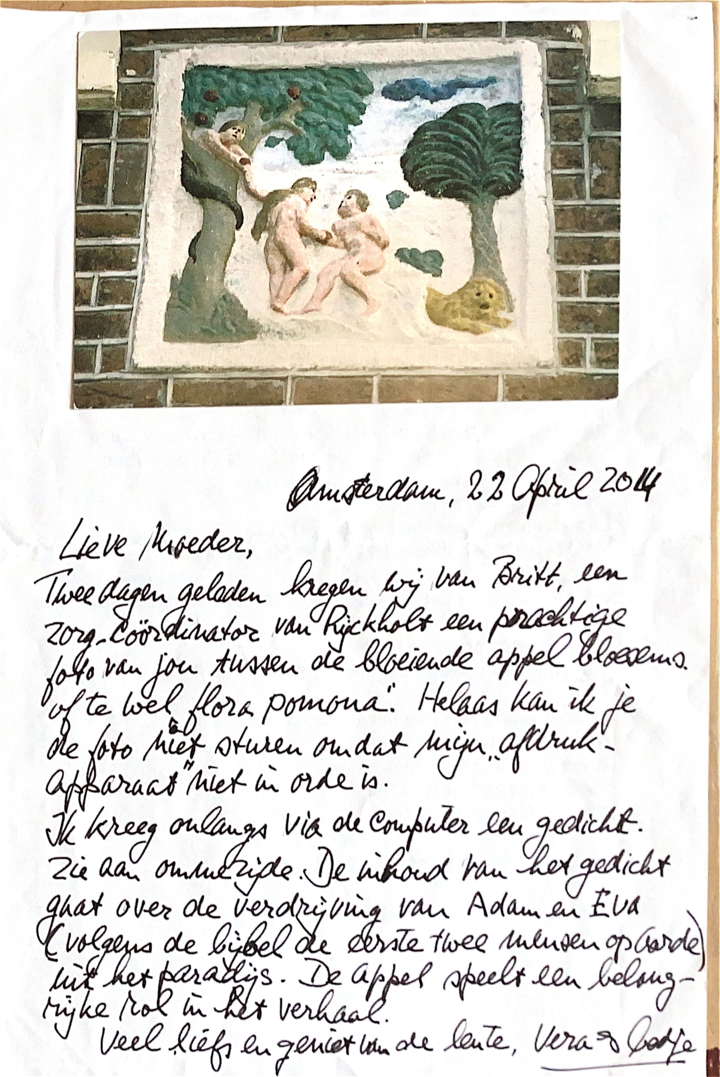 Twee dagen geleden kregen wij van Britt, een zorg-Coördinator van Rijckholt, een prachtige foto van jou tussen de bloeiende appelbloesems, of te wel "Flora Pomona". Helaas kan ik je de foto niet sturen omdat mijn afdrukapparaat (printer) niet in orde is.