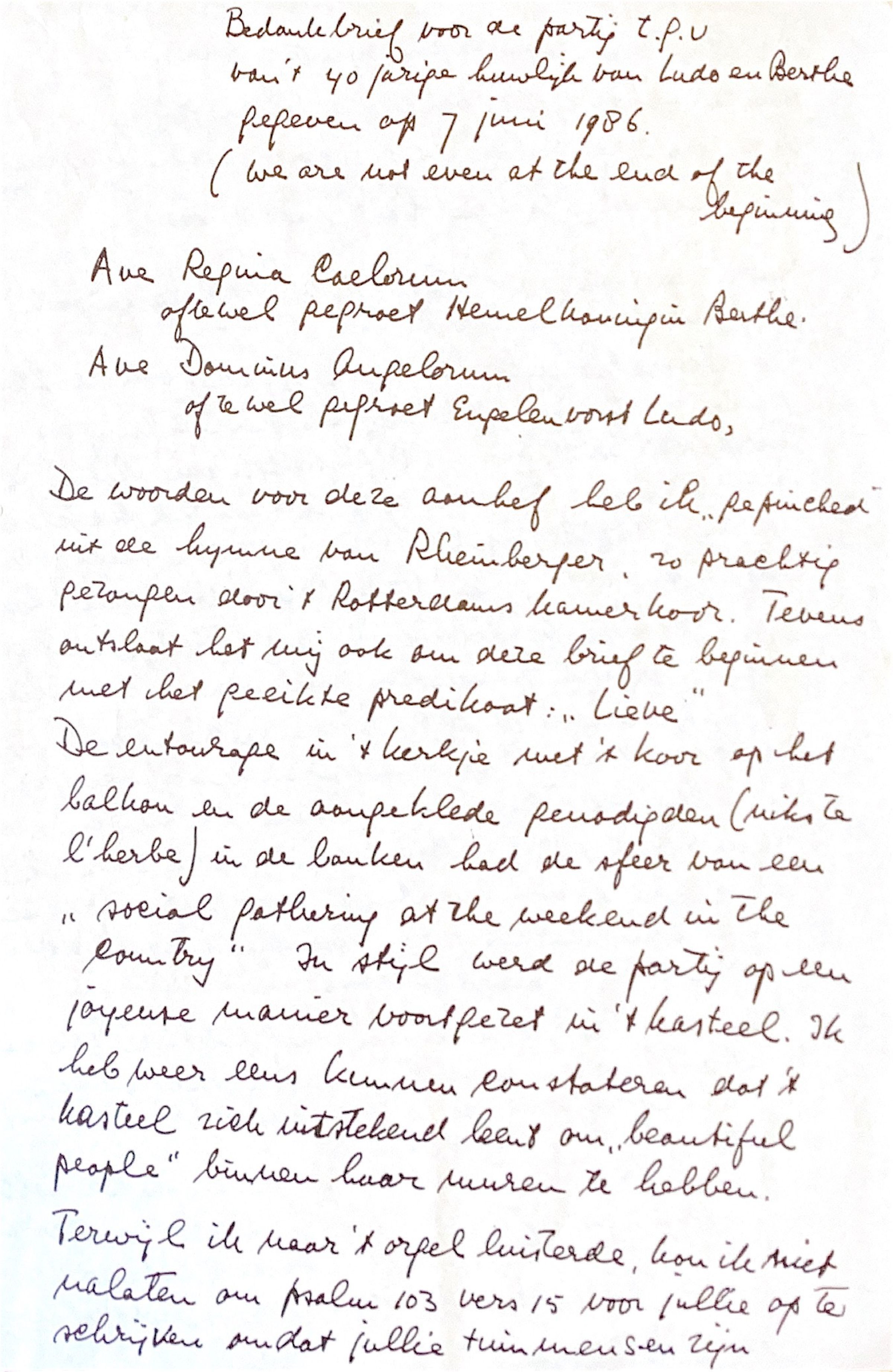 De woorden voor deze aanhef heb ik" gepinched" uit de hymne van Rheinberger, dat zo prachtig werd vertolkt door het Rotterdams Kamerkoor. Teven ontslaat het mij ook om deze brief te beginnen met het geijkte predikaat : "Lieve".