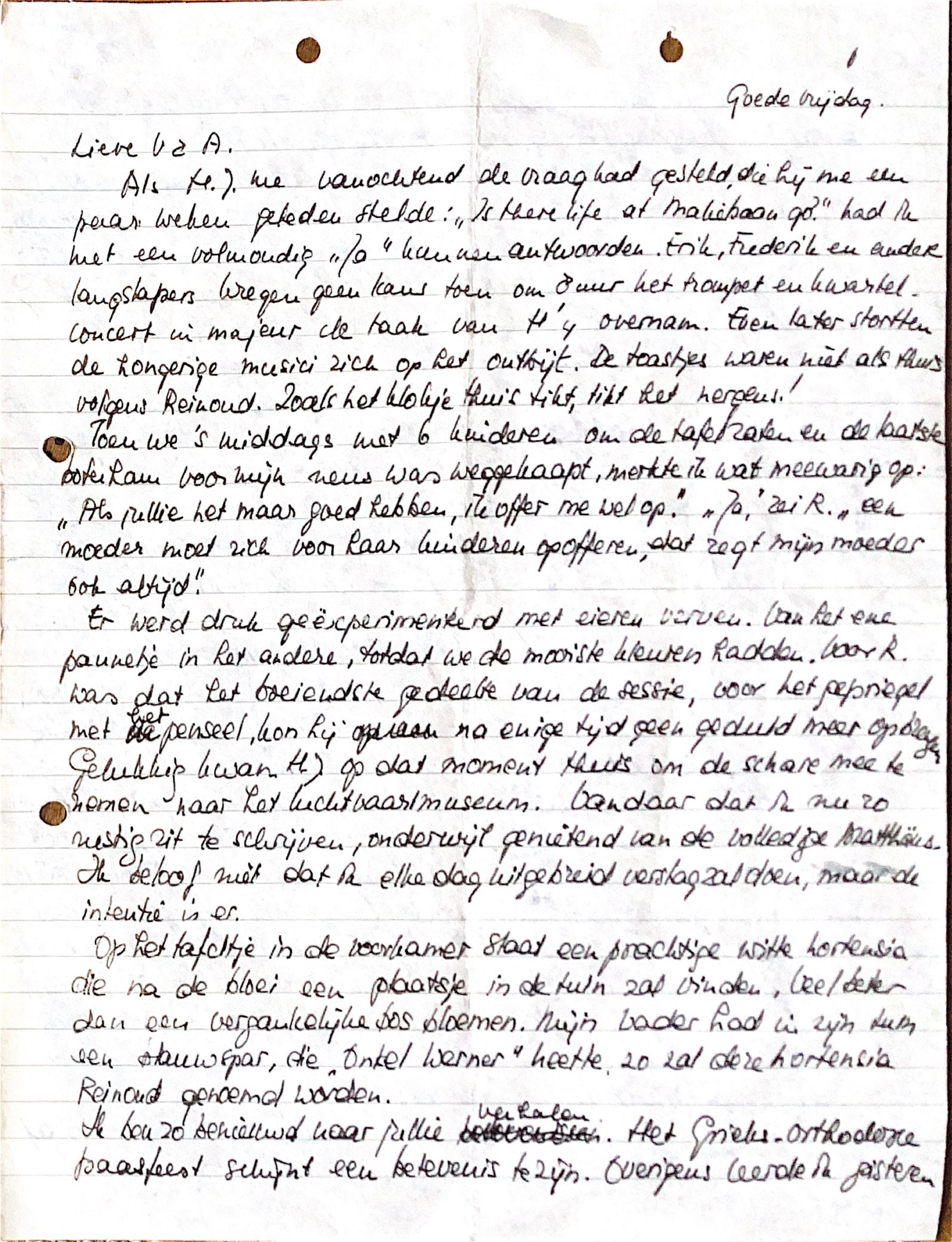 Toen we 's-middags met 6 kinderen om de tafel zaten en de laatste boterham voor mijn neus was weggekaapt, merkte ik wat meewarig op: " Als jullie het maar goed hebben, ik offer mij wel op!" "Ja" zei Reinoud,"een moeder moet zich. voor haar kinderen opofferen,, dat zegt mijn moeder ook altijd."