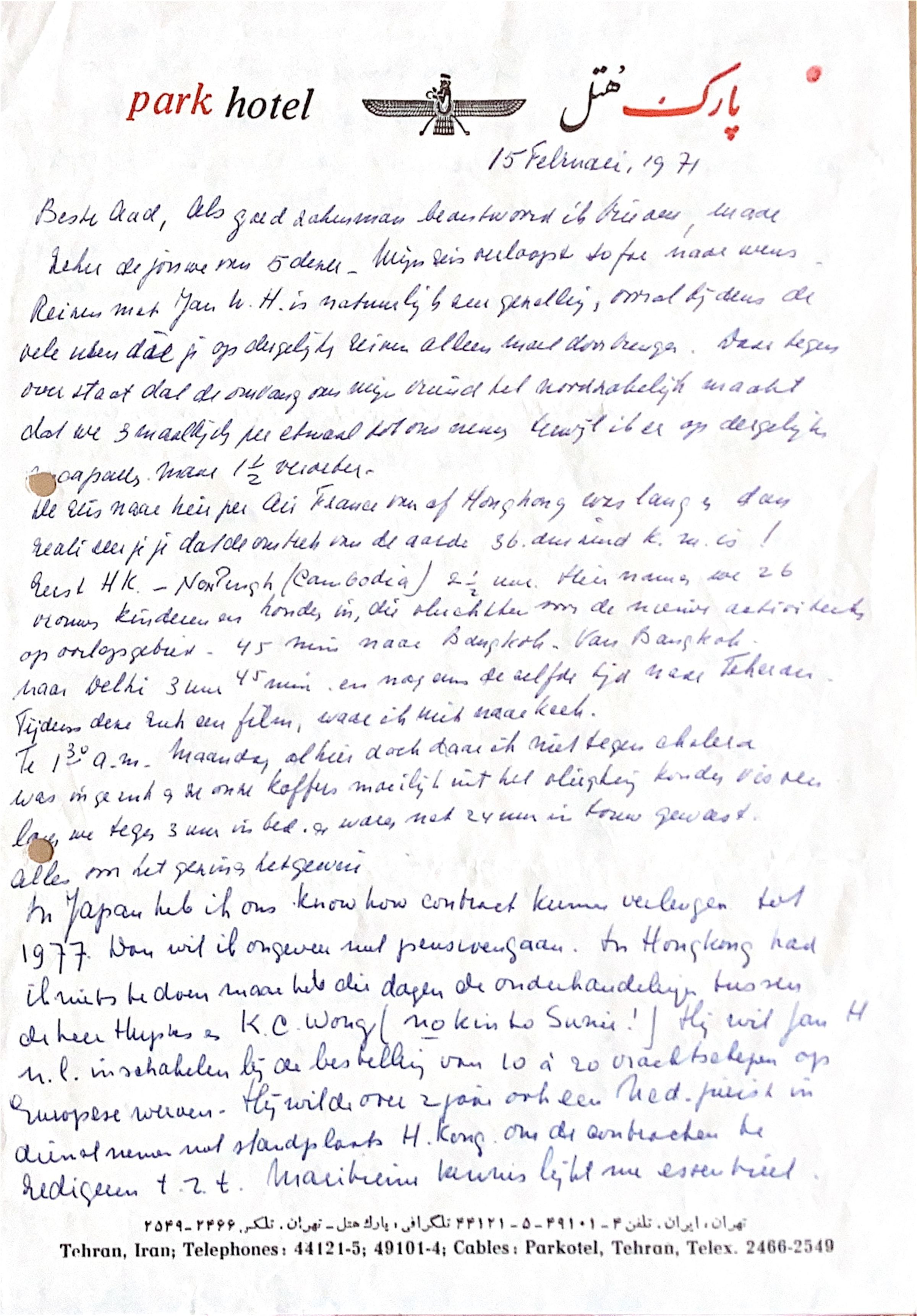 Maandag om 01.30 uur am al hier in Teheran, doch daar ik niet tegen cholera was ingeënt en ze onze koffers moeilijk uit het vliegtuig konden vissen. lagen we tegen 03.00 uur am in bed en waren 24 uur in touw geweest.