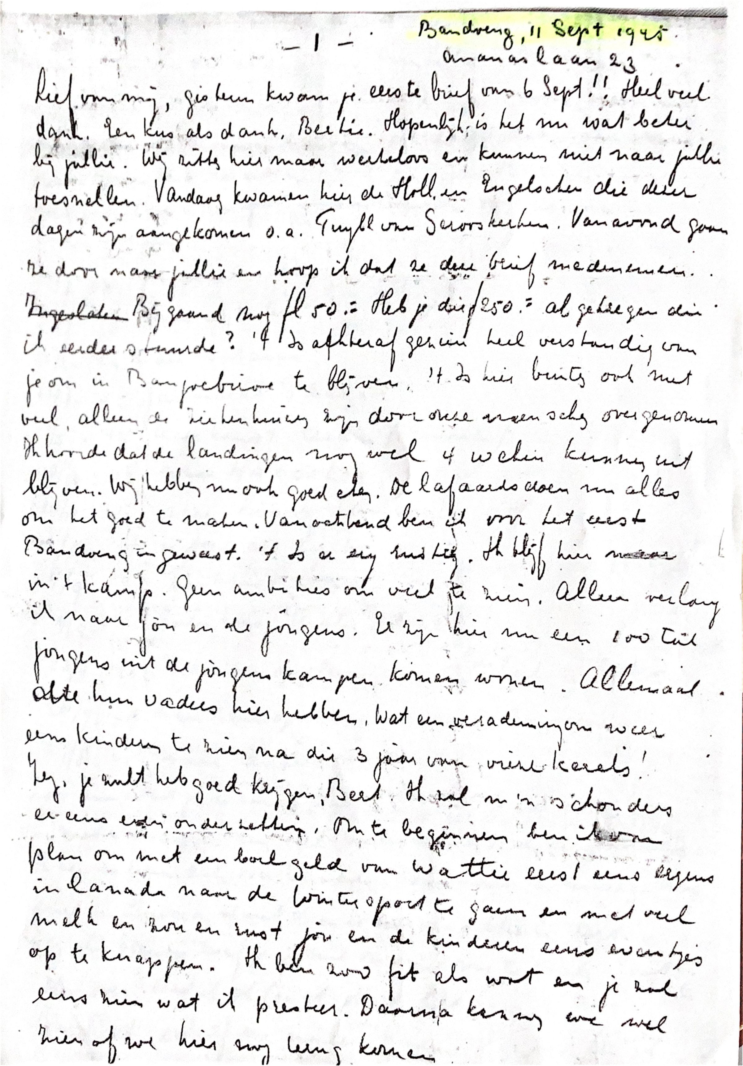 Gisteren kwam je eerste brief van 6 sept.!! Heel veel dank. Een kus als dank, Bertie. Hopelijk is het nu wat beter bij jullie. Wij zitten hier maar werkeloos en kunnen niet naar jullie toesnellen..Vandaag kwamen hier de Holl.ders en Engelschen die dezer dagen zijn aangekomen o.a. Tufyl van Serooskerken. Vanavond gaan door naar jullie en hoop ik dat ze deze brief medenemen. Ingegesloten, bijgaand nog fl.50,- (gulden). Heb je die fl.250,- al gekregen, die ik eeder stuurde ? Is achteraf gezien heel verstandig van je om in Banjoebiroe te blijven. 't Is hier buiten ook niet veel, alleen de ziekenhuizen zijn door onze menschen overgenomen.