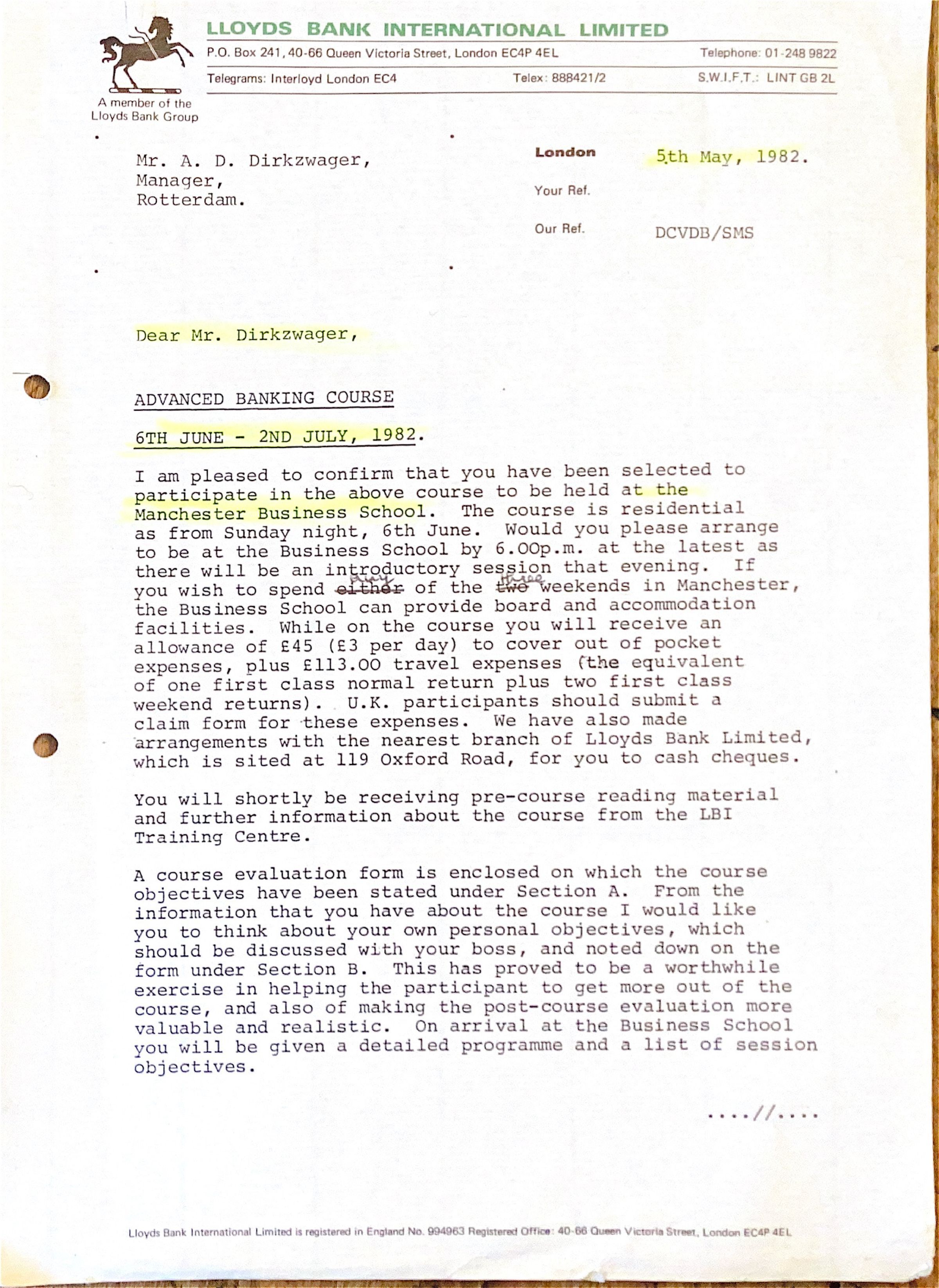 1982-05-05 Letter from the Lloyds Bank. ADD to paticpate in the Advance Banking Course of the Manchester Busiiness School.