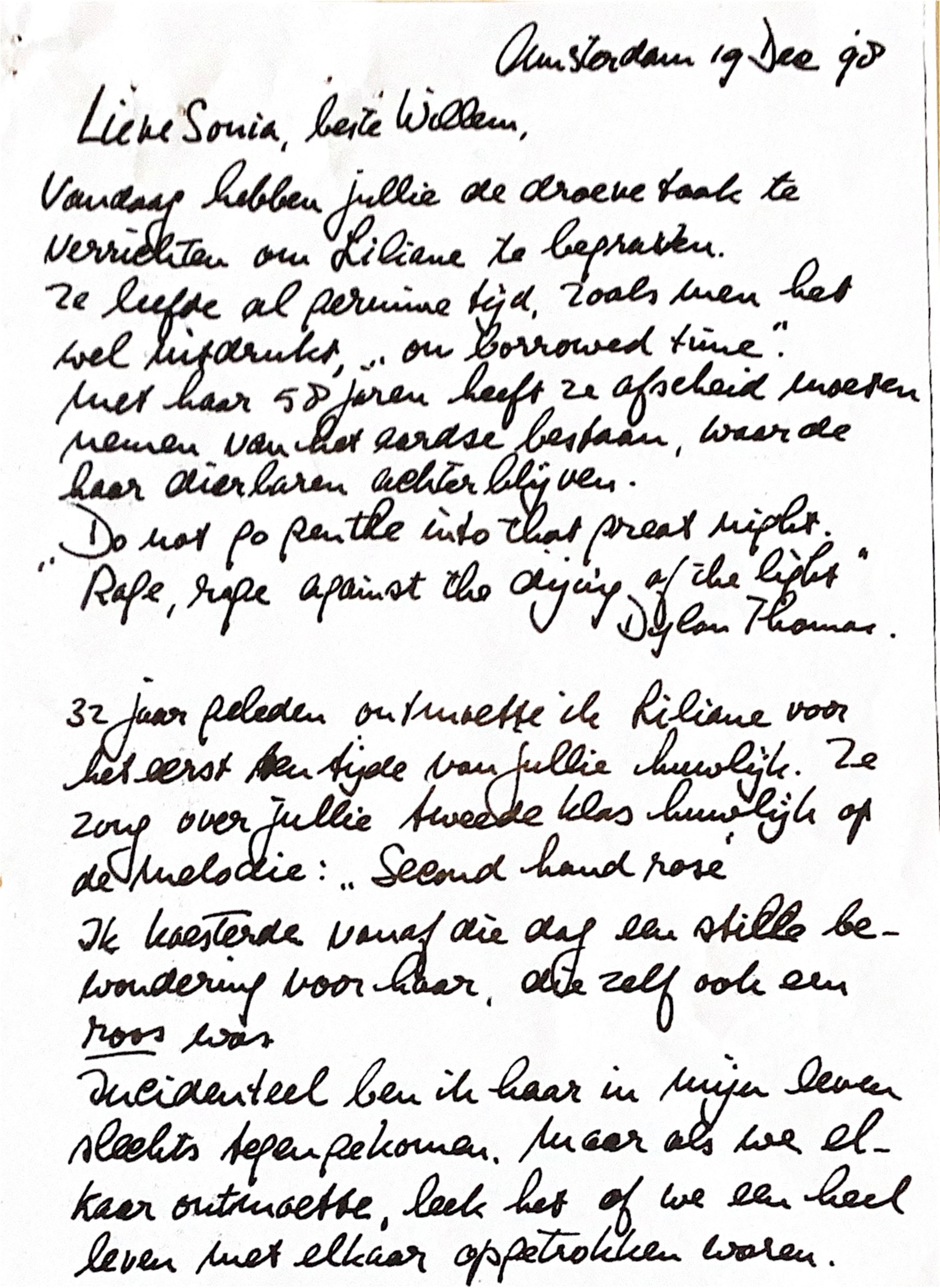 32 Jaar geleden ontmoette ik Liliane voor het eerst ten tijde van jullie huwelijk. Zij `zong jullie toe over een 'tweede klas huwelijk' op de melodie:"Second hand Rose.' Ik koesterde van af die dag een stille bewondering voor haar, die zelf ook een 'Roos' was.