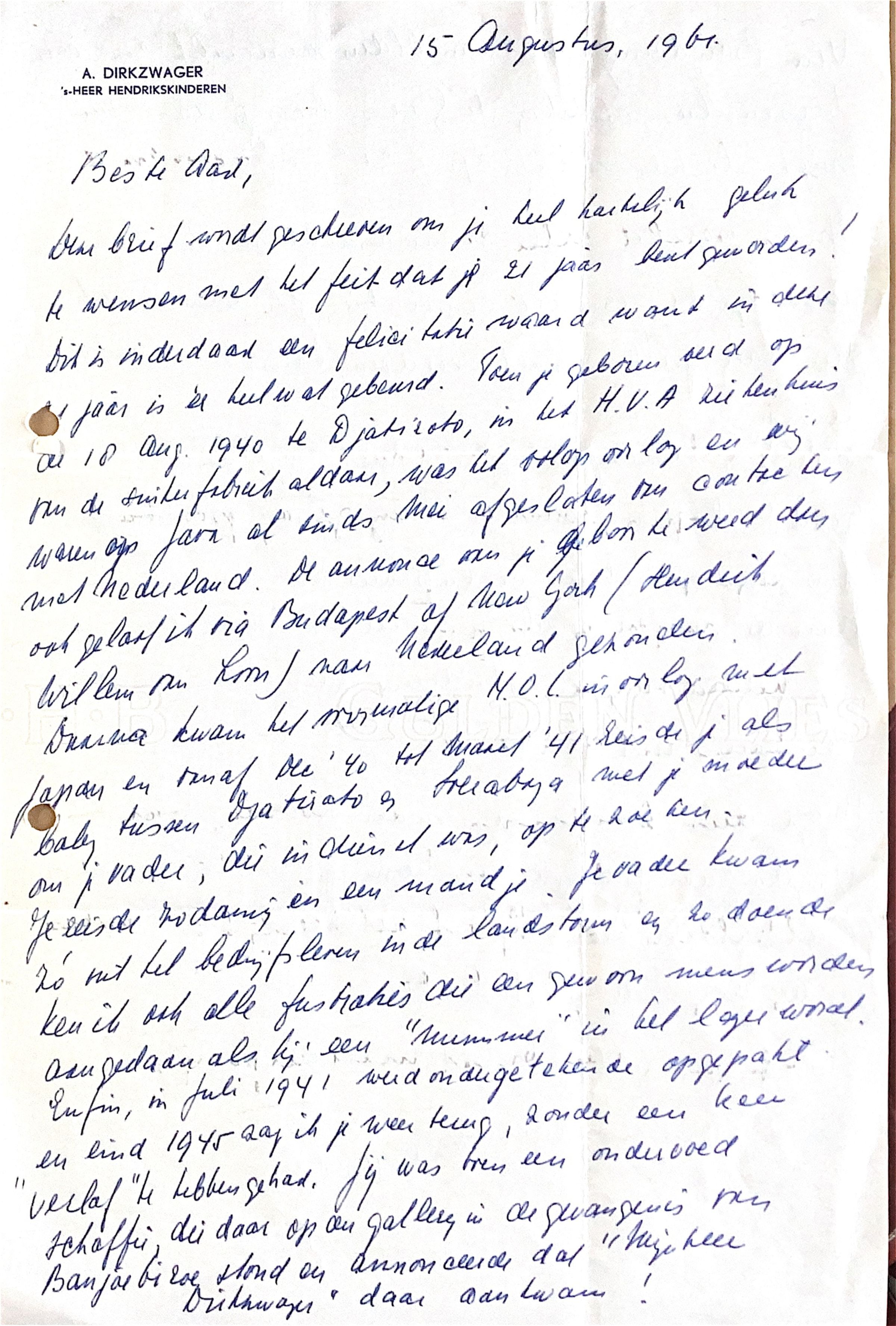 Deze brief wordt geschreven over je heel hartelijk geluk te wensen met het feit dat je 21 jaar bent geworden. Dit is inderdaad een felicitatie waard, want in de vijf jaar is er wat gebeurd. Jij bent geboren op 18 augustus 1940 te Djakarta in het H.V.A. Rietvennest. Per de suitebrief aldaar was het opeens les aan as wanen als farao. Al sinds mei gesloten zijn geweest tegen de methode van land. De annonce sur jij geven le weet du, of splast it via Boedapest of New York/Hendrik Willem Su Konfman Moreland gehouden Duma. Kwam het mislukte N.O.C. in Onlyret Japan en Real december 1940 tot Mani 4/ Leisch als baby kussen of Matsato es Miyabuja mel je in vreugde met jouw vader; die indien wel is, op te heffen. Jouw reis de Modamis en ben met je vader kwam nooit echt bedingt leven in de landstom en te doen de ken het toch alle Justichès die enzuiver mens worden aangedaan als hij een "nummer" in het lager wordt. Enfin, in juli 1941 werden ondertekende opgepakt en eind 1945 zag het je een temp, zonder een keer "verhalen" te hebben gehad. Jij was tien en onderdoek scheef, die daar op de galerij in de gevangenis Men Bandoengstond en annonceerde dat "Mijnheer Dirkzwager" daar vandaan kwam. Via Bandoeng, misschien van Oldenbarnevelt en een hersenvliesontsteking be Guesben je dus een met "lichte" ste af op je 21ste verjaardag. In een wereld waar veel macht am Berlin en waar de Gouden Generatie, die de Kache Un aan Gullumal ordineren, met trots behoefte Origem behaalden wij met "Bild Lied" mondig te zijn, want er is menig positiefs over jeugd op school verliep hel veel aangenamer dan de muziek als je in de haus helt of in Leiden te gaan studeren dan nog in het del een kous niet dein hond. Ik ga dus donderdweg met Konden, hat Uridadupidentesen kom de 21 essomares mel billem been. Hij heeft het hierbij te in Engeland en hij krijgt de beste wensen. Hoog goed, was bronf meerderjarig, 1 Vody.
